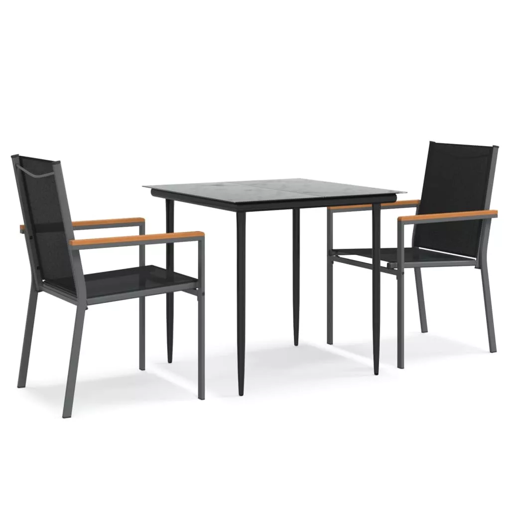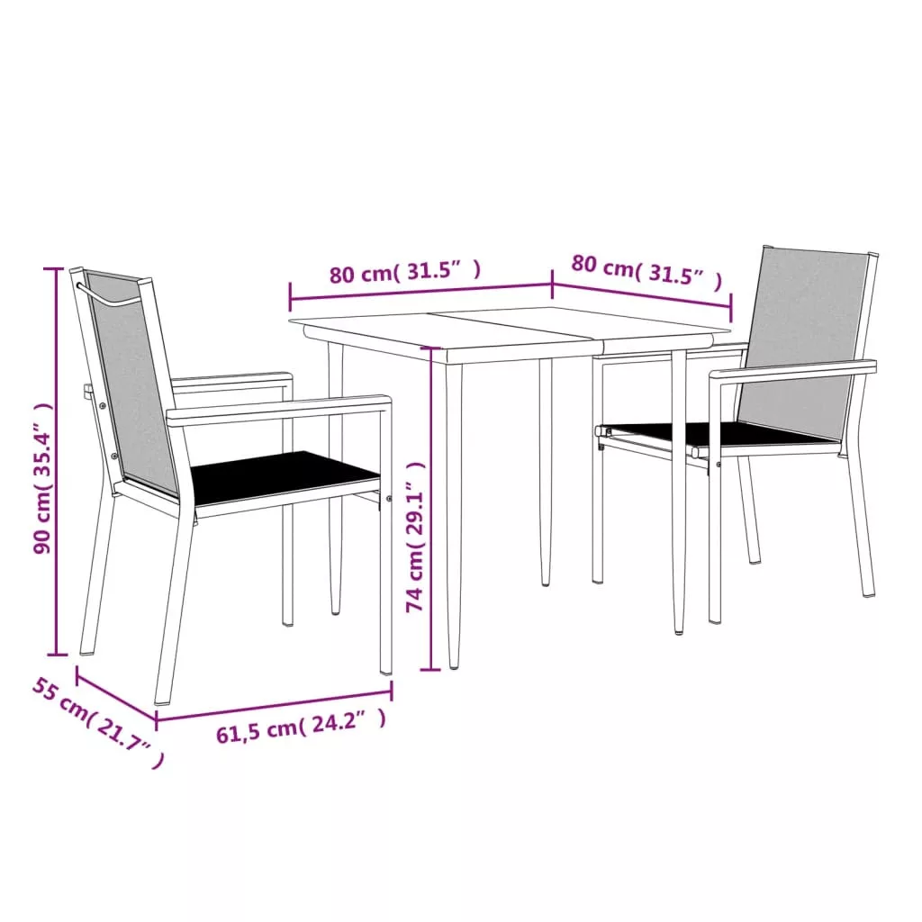 Pihenjen és élvezze a délutáni teázást vagy bármilyen étkezést családjával és barátaival ennél a kerti étkezőgarnitúránál ülve! Tartós anyag: A textilén szövet lehetővé teszi a szellőzést, miközben ellenáll az UV sugárzásnak. Ez teszi a textilént ideálissá a meleg időben. Tartós és erős anyagként rendkívül ellenálló a szakadással, szúrással és penésszel szemben.Erős és stabil váz: Az acélváz masszívvá és stabillá teszi az étkezőgarnitúrát a mindennapos kültéri használathoz.Praktikus asztallap: Az étkezőasztal sima asztallapja edzett üvegből készült, amely nedves ruhával könnyen tisztítható. Ezenkívül kitűnően alkalmas ételek, italok és egyéb dísztárgyak elhelyezésére.Kényelmes ülés: Az étkezőszék háttámlával és karfákkal rendelkezik, így kényelmes ülést biztosít. Megjegyzés:A kültéri bútor szépségének megőrzése érdekében javasoljuk, hogy vízálló huzattal fedje be. Maximum 110 kg ülésenként.