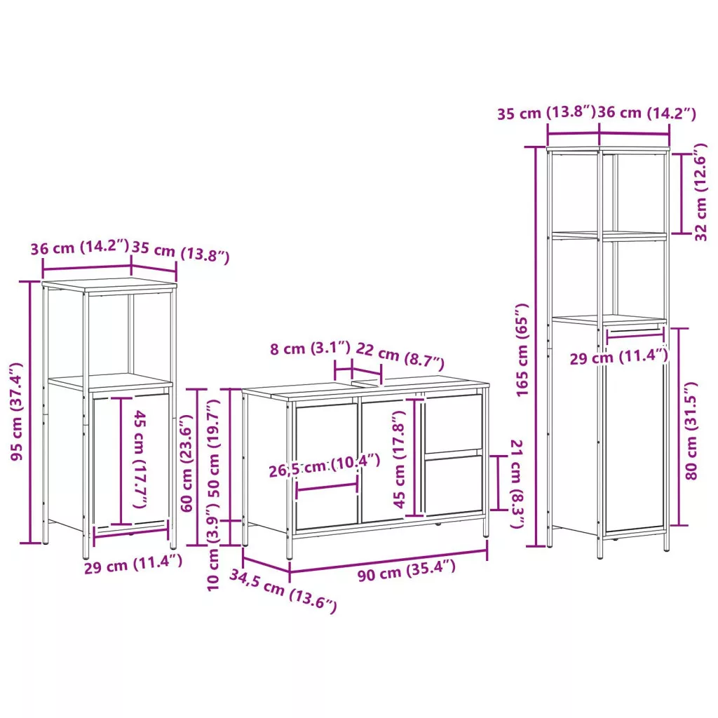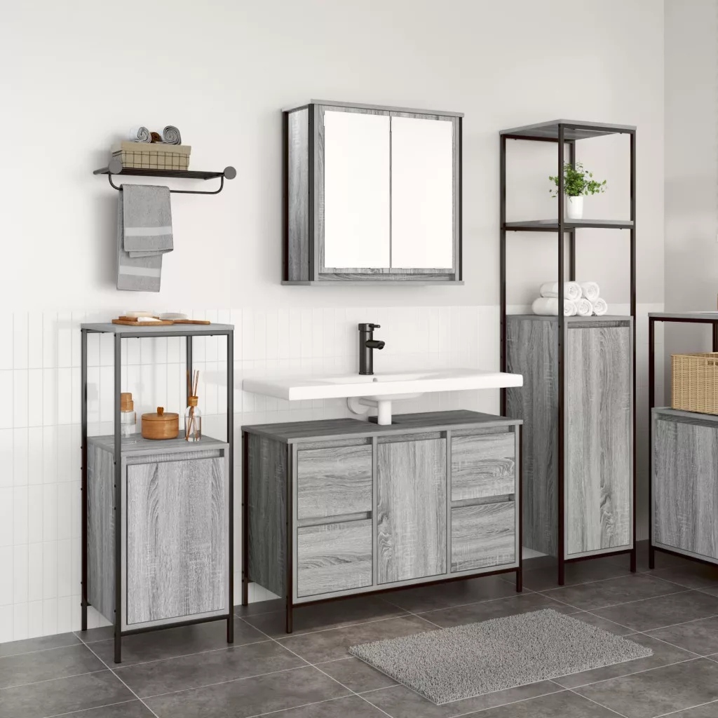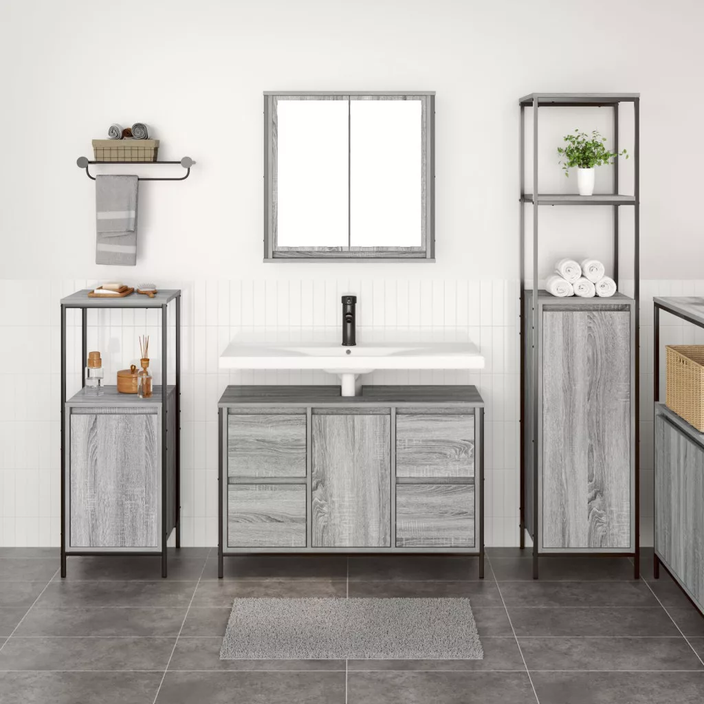 Ez a fürdőszoba bútor szett a funkcionalitás és a modern stílus keverékéről szól, így tökéletes a fürdőszobai alapvető dolgok rendezettségéhez. Klasszikus szürke sonoma felület, egy mosdószekrény és két magas szekrény, amelyek ötvözik a stílust és a praktikus tárolást a tér javítása érdekében.