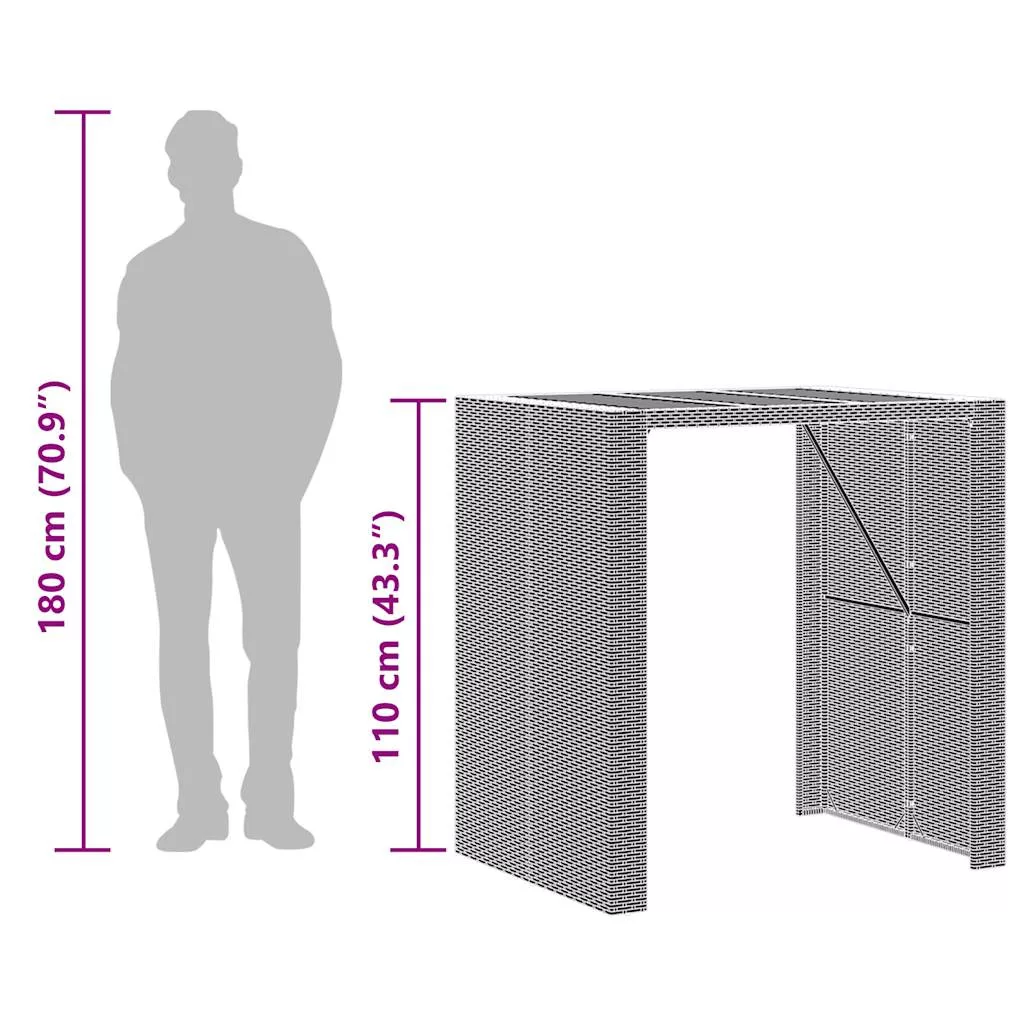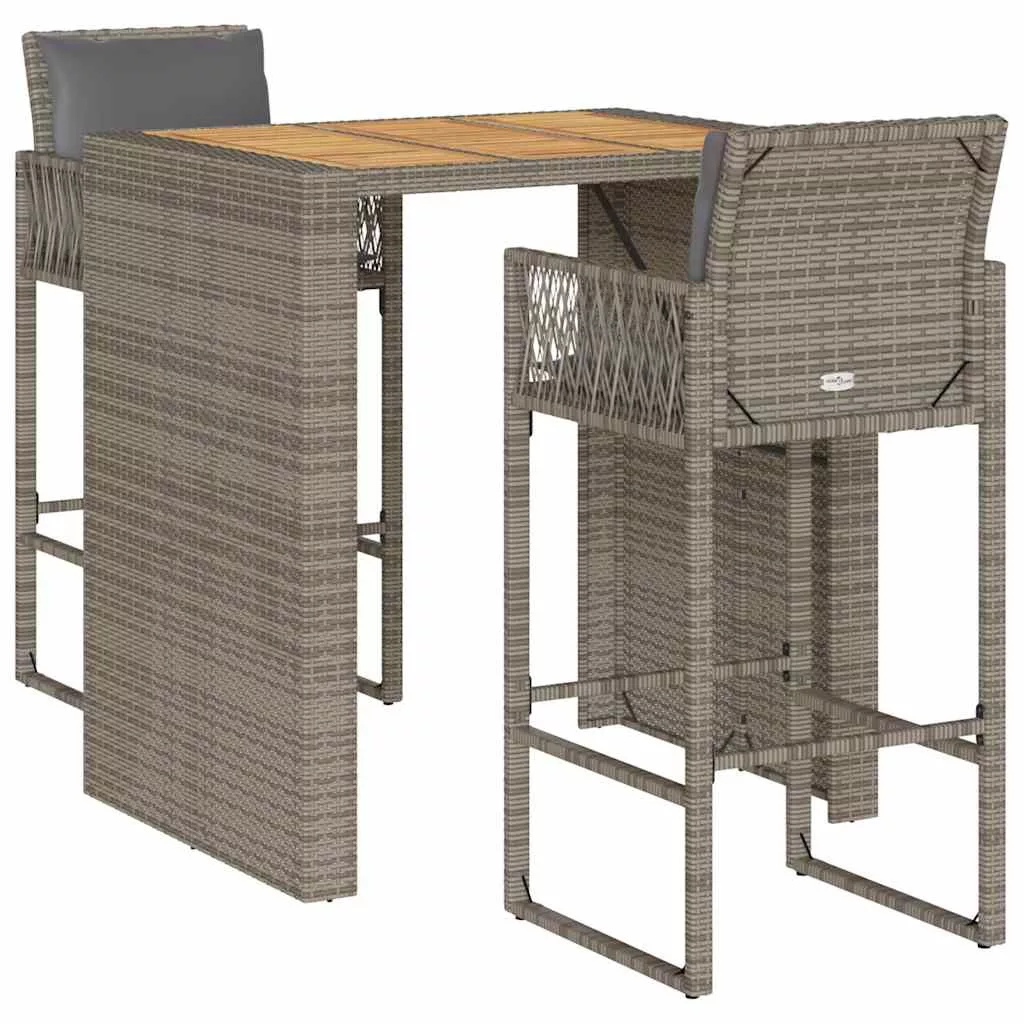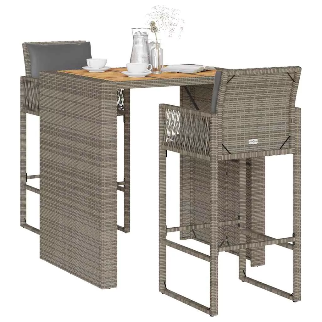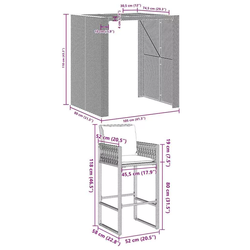 Ez a divatos kerti bárszett, amely egyszerre elegáns és praktikus, garantáltan kertje, udvara vagy bármilyen egyéb környezet központi eleme lesz. Időjárásálló anyag: A PE-rattan, más néven polyrattan, időjárásálló és könnyen tisztítható. Sokáig megőrzi szépségét a szabadban. Kiváló minőséget, kényelmet és esztétikus megjelenést garantál.Kényelmes ülés: A bárszéket háttámasszal és beépített lábtartóval tervezték, hogy kényelmes ülésélményt nyújtson. A vastagon bélelt ülőpárna maximális kényelmet biztosít ülés közben.Erős és stabil váz: A porszórt acélváz masszívvá és stabillá teszi a bárgarnitúrát a mindennapos kültéri használathoz.Széleskörű felhasználás: A különleges kialakítású bárasztal és szék kellemes összképet teremt, és bármilyen környezetbe illik. Jó tudni:A szerelés megkönnyítése érdekében minden termék kézikönyvvel együtt kerül kiszállításra.Megjegyzés:A kültéri bútor szépségének megőrzése érdekében javasoljuk, hogy vízálló huzattal fedje be. Maksimális 110 kg ülésenként. Legyen tudatában a nyílt tűz és más erős hőforrások kockázatának a termék környezetében.