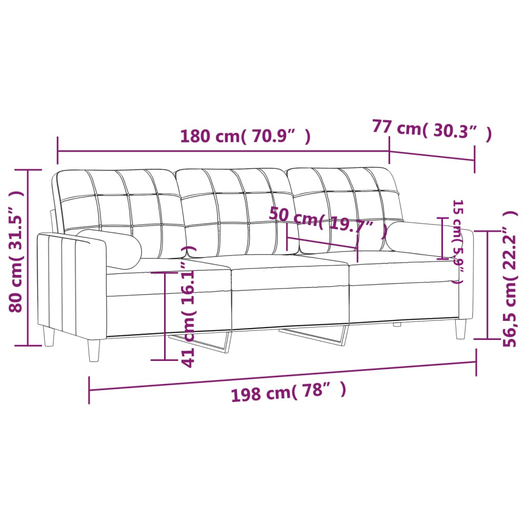 Ez a 3 személyes kanapé, mely modern dizájnjával és díszpárnáival tűnik ki, kiváló helyet kínál beszélgetéshez, tévézéshez vagy egyszerűen csak pihenéshez. Tartós szövet: Az anyag egyszerű és letisztult megjelenésű, valamint légáteresztő és tartós.Masszív és stabil váz: A fémből készült váz szilárdságot és stabilitást biztosít a társalgókanapénak.Eltávolítható párnahuzatok: A cipzáras zárásnak köszönhetően ezeknek a párnáknak a huzata könnyen eltávolítható és szükség esetén tisztítható.Kényelmes ülésélmény: A kanapé rendkívül kényelmes a vastagon párnázott üléseknek, karfáknak és hátpárnáknak köszönhetően. Emellett a dekoratív párnák extra kényelmet nyújtanak, ha ül vagy fekszik. Maksimális 110 kg ülésenként. Legyen tudatában a nyílt tűz és más erős hőforrások kockázatának a termék környezetében.
