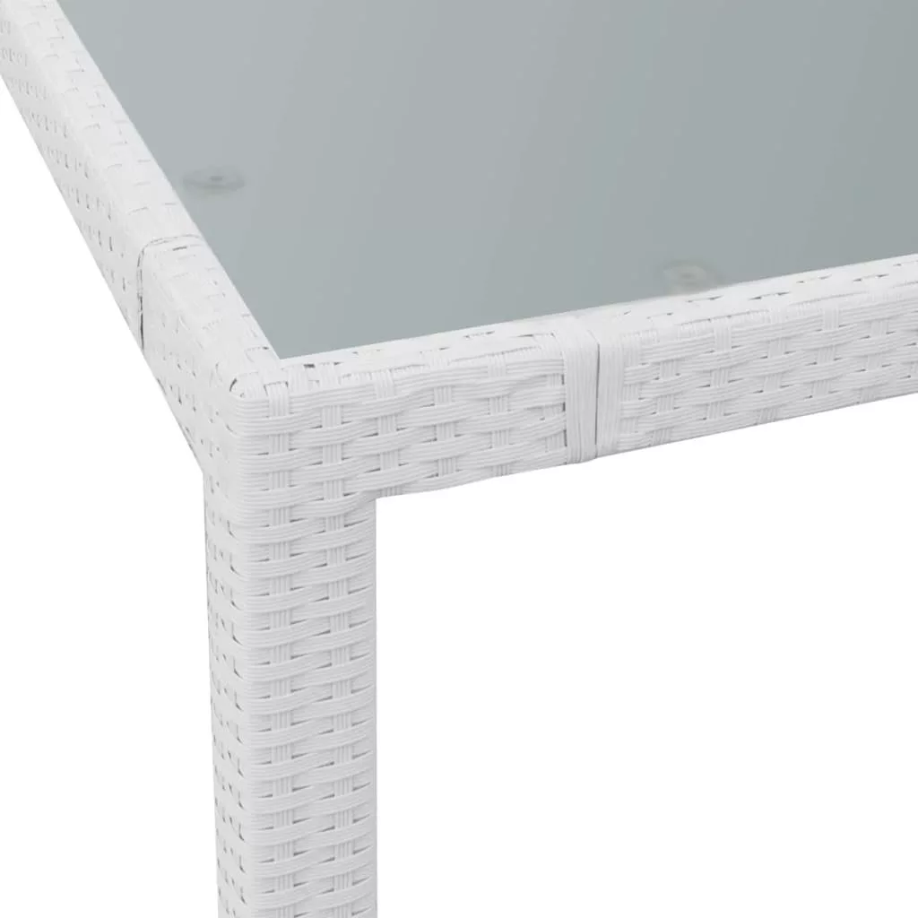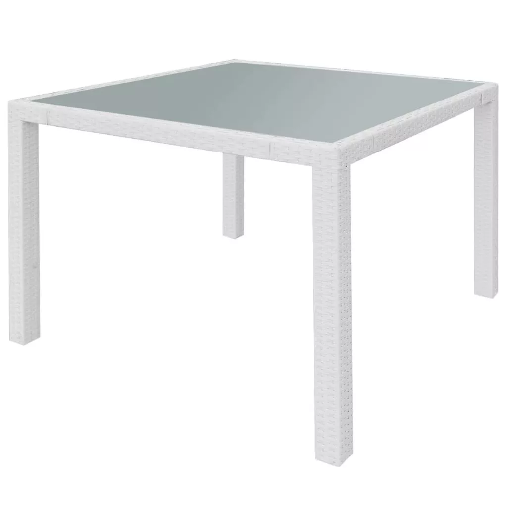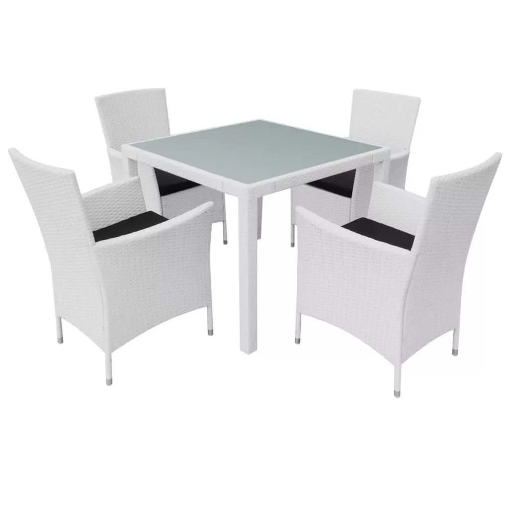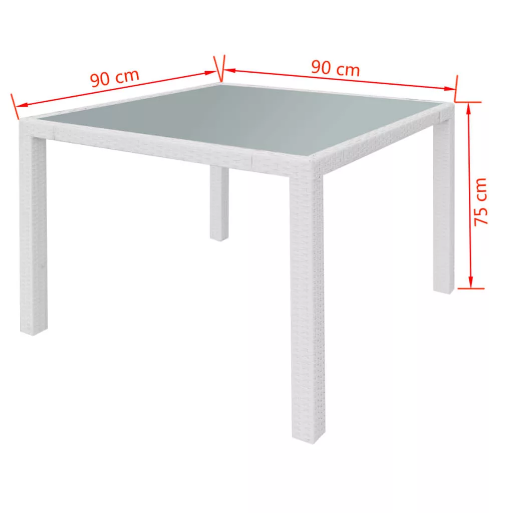 Ez a kerti rattan étkezőkészlet elegáns kialakítású, és kertje, verandája vagy terasza fénypontja lehet. Az időjárásálló és vízálló PE rattanból készült asztallap, egy homályos edzett üvegből áll, amely könnyedén tisztítható, tartós és megfelelő a mindennapi használatra. A pór-szórt acél keret az asztalt és a széket nagyon tartóssá teszi. A könnyűsúlyú felépítésnek köszönhetően könnyen mozgathatóak. A vastag kivehető párnák rendkívül kényelmesek. A cipzárral ellátott huzatok könnyedén levehetőek és moshatóak. A szállítás 1 üveglapos asztalt, 4 széket és 4 párnát tartalmaz. Figyelem: Eső, hó vagy fagy esetén azt tanácsoljuk, hogy takarja le a terméket.