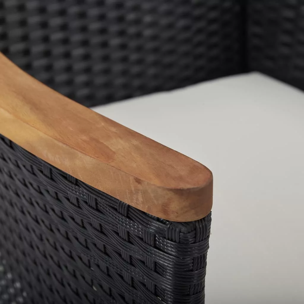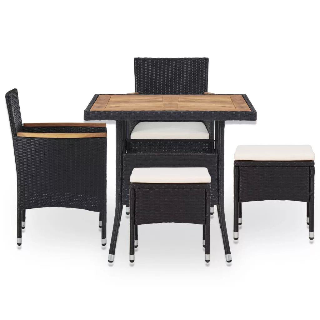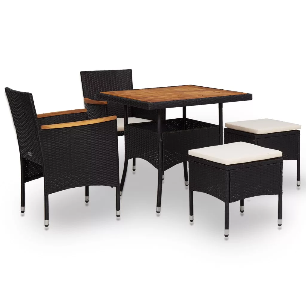 Ruházza fel otthonát impozáns, odaillő esztétikus kiegészítővel, és fogyassza el vacsoráját kényelmesen a kertben ötrészes étkezőszettünknél! Az egy étkezőasztalból, két karfás székből és két zsámolyból álló étkezőszett kiválóan alkalmas kerti összejövetelekhez! Az étkezőszett megerősített acél váza, melyet elegáns, időjárásálló, kézzel szőtt polietilén rattan takar, erős tartást biztosít, és egész évben használható. Az asztallap és a kartámaszok minőségi tömör akácfából, egy trópusi keményfából készültek, amely időjárásálló, és évekig tartó használatot biztosít. A kivitelezésnek és a gyönyörű faerezetnek köszönhetőn minden bútordarab egyedi, és kissé különbözik a többitől. Az extra kényelem érdekében mindegyik szék vastagon párnázott, levehető párnával rendelkezik. A levehető párnahuzatok cipzárasak. Emellett a könnyű rattan szerkezet megkönnyíti a darabok mozgatását, újrarendezését és szállítását. A küldemény 1 db étkezőasztalból, 2 db karfás székből, 2 db zsámolyból és 2 db ülőpárnából áll. Fontos megjegyzés: A bútorok színe darabonként változhat, így minden étkezőszettünk egyedi. Az élettartam növelése érdekében javasoljuk, hogy eső, hó, fagy vagy egyéb zord időjárási körülmény esetén takarja le a szettet.
