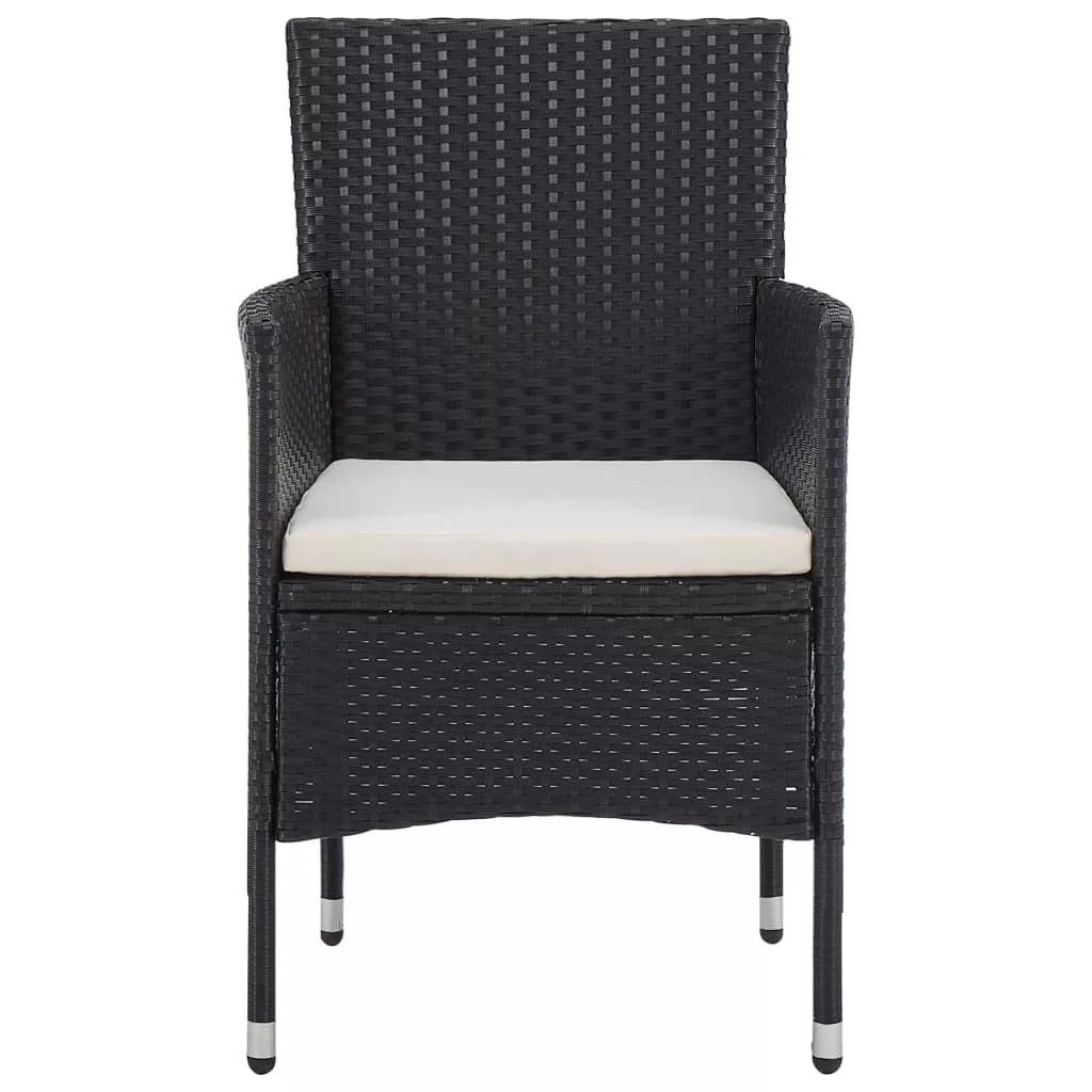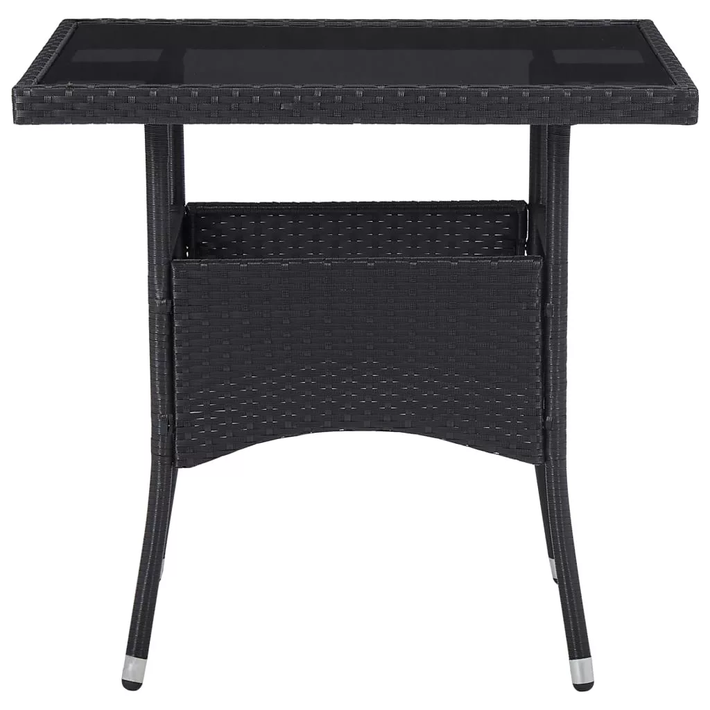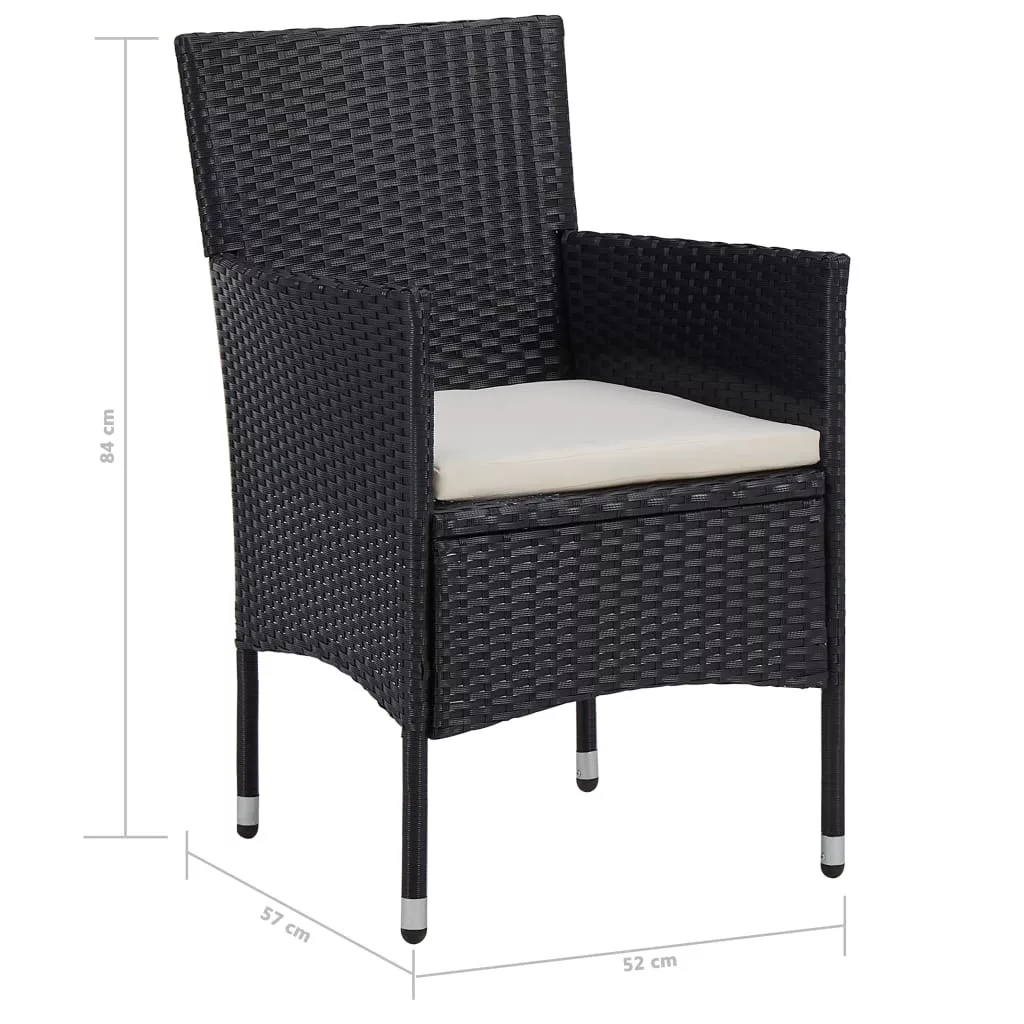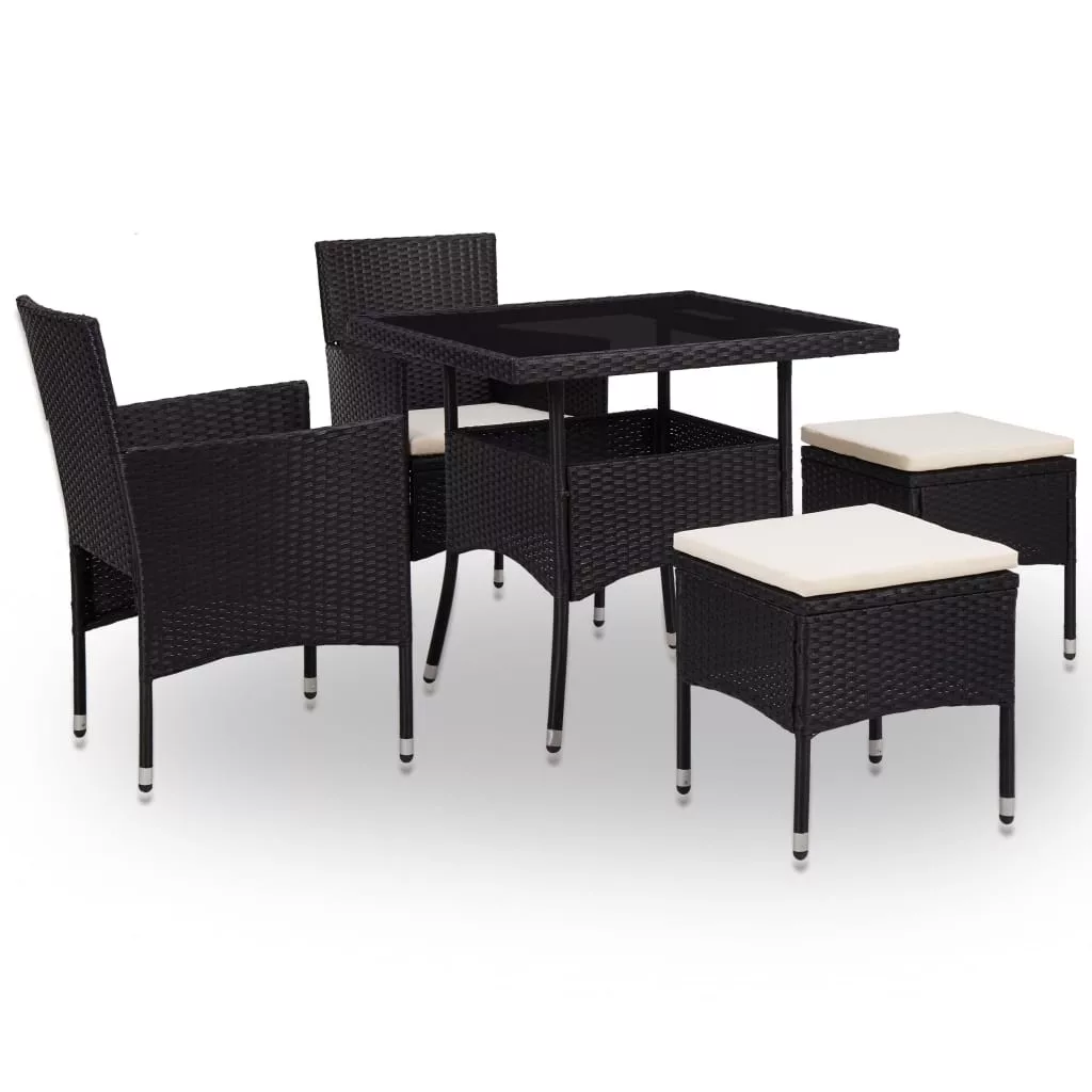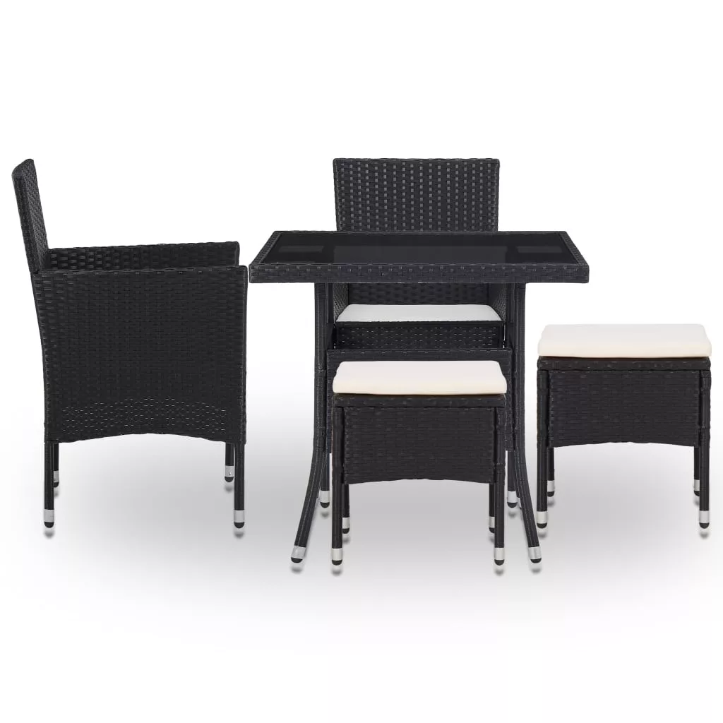 Élvezze a családi összejöveteleket a szabadban ezzel az 5 részes étkezőgarnitúrával! Az étkezőszett tökéletesen kielégíti vendégei igényeit, valamint remek helyet kínál a szabadban való étkezéshez. Ez az UV-álló PE rattanból és erős porszórt acélvázzal készült étkezőgarnitúra időjárásálló, és hosszú évekig tartó használatot biztosít. Az edzett üveg asztallap sima, könnyen tisztítható felületet biztosít. A garnitúránál akár 8 ember is elfér a zsúfoltság érzése nélkül. Minden szék levehető, vastagon bélelt párnával lett ellátva a pihenés kényelme érdekében. Mindegyik párnahuzat cipzáros, levehető kialakítással bír. A könnyű rattanszerkezetnek köszönhetően mindegyik bútordarab könnyen mozgatható, áthelyezhető és szállítható. A küldemény 1 db étkezőszékből, 2 db karfás székből, 2 db zsámolyból és 4 db ülőpárnából áll. Figyelem: Az élettartam növelése érdekében javasolt letakarni az asztalt eső, hó, fagy vagy egyéb zord időjárási körülmény esetén.