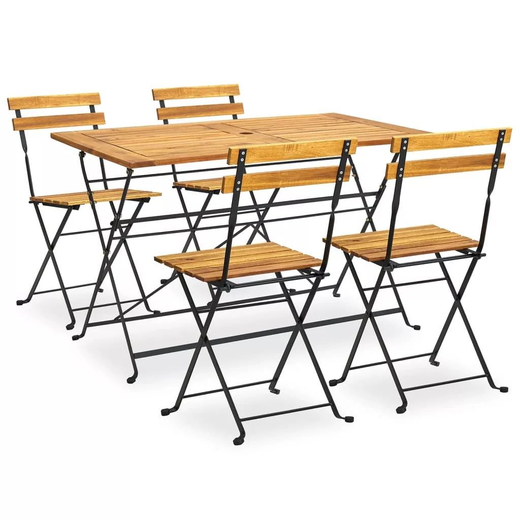 Ez a stílusos kültéri fa étkezőgarnitúra nem csupán extra ülőhelyet kínál, de egy csipetnyi rusztikus bájjal dobja fel kertjét, teraszát vagy udvarát! Ez a kerti étkezőgarnitúra tömör akácfából, egy trópusi keményfából készült, amely időjárásálló és rendkívül strapabíró. A masszív acél további stabilitást is biztosít. Az asztal és a székek nedves ruhával könnyen tisztíthatók és használaton kívül helytakarékosan összecsukhatók. Ezenkívül az asztallap közepén található 5 cm átmérőjű lyuk készen áll egy napernyő befogadására. Megjegyzés: kültéri bútora élettartamának meghosszabbítása érdekében javasoljuk, hogy tisztítsa rendszeresen, és ne hagyja feleslegesen a szabadban, védelem nélkül.Tisztítás: használjon enyhe szappanoldatot.Tárolás: Ha lehetséges, tárolja zárt, hűvös, száraz helyen. Ha a terméket a szabadban tárolja, védje vízálló burkolattal. Eső vagy havazás után törölje le és szárítsa fel a felesleges vizet vagy havat a sima felületekről. Hagyjon elegendő légkeringést a nedvességből eredő károk elkerülése érdekében. Maximum 110 kg ülésenként.