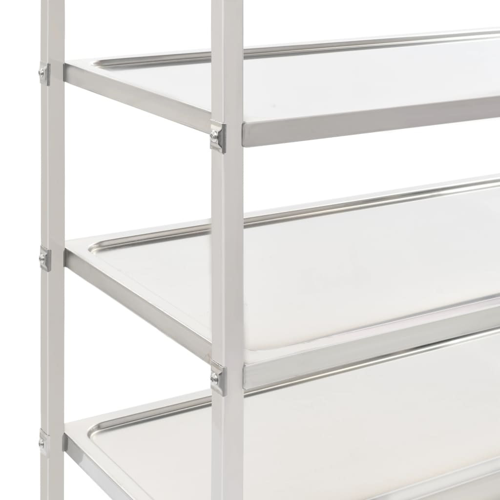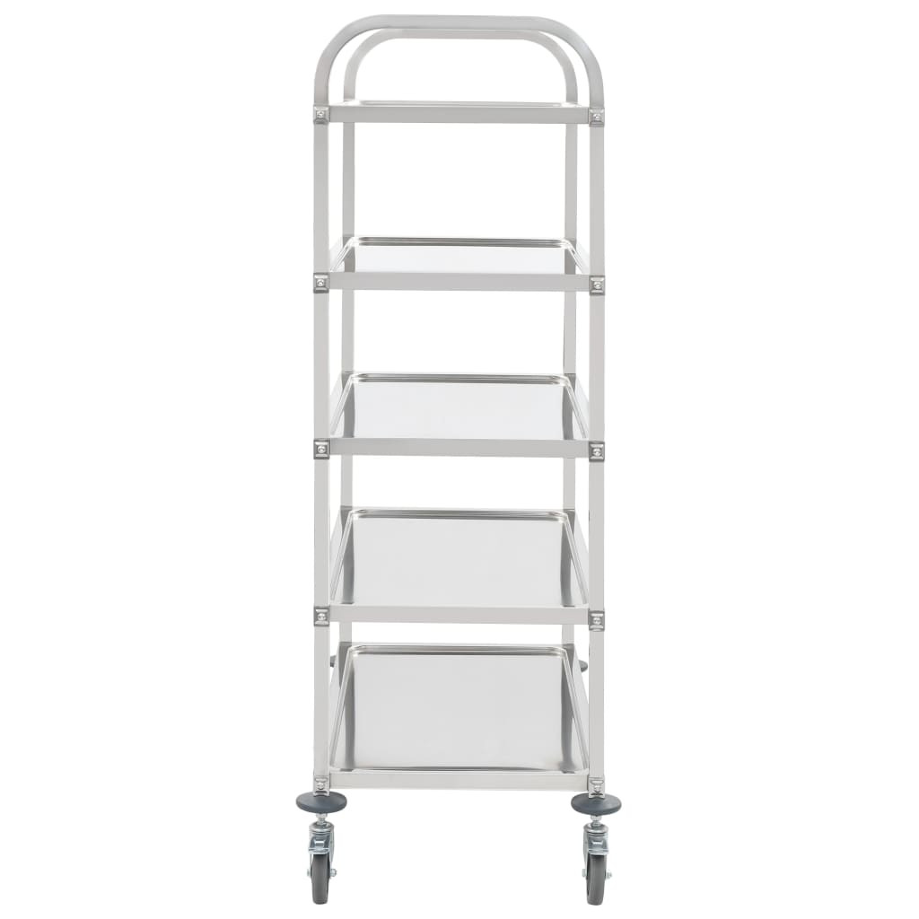 Ez az 5 szintes zsúrkocsi robusztus szerkezetének hála nemcsak a konyhában jön jól, hanem partikon is. Könnyedén szolgálhatunk fel vele ételeket és italokat, valamint egyszerűen szállíthatunk edényeket rajta a konyhában. Ez a nagyméretű zsúrkocsi bőséges helyet kínál az ételek és italok optimális felszolgálásához. A rozsdamentes acélváznak köszönhetően a szervizkocsi még teljes terhelés alatt is stabil és masszív marad. Zökkenőmentes görgőinek hála erőlködés nélkül, halkan mozgatható. Emellett két görgő fékkel is fel lett szerelve, így megakadályozva az elgurulást, ami azt jelenti, hogy akár szerszámok vagy egyéb napi használatban lévő háztartási eszközök tárolására is alkalmas. A zsúrkocsi könnyen összeszerelhető.