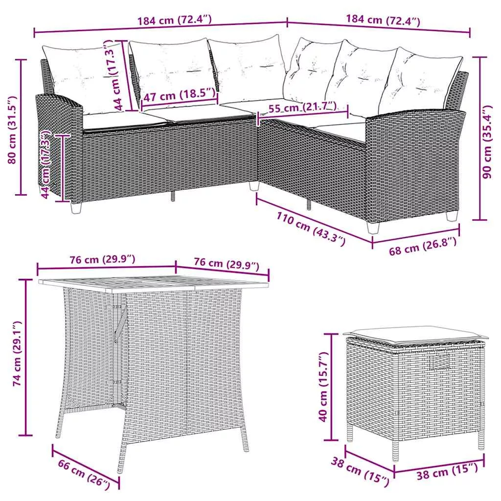 Ez az L alakú kerti kanapé tökéletes kiegészítője kertjének, teraszának vagy teraszának, kényelmes és hívogató helyet biztosítva a családdal és barátokkal való beszélgetéshez vagy egyszerűen csak a pihenéshez és a szabadban való kikapcsolódáshoz. Tartós anyag: A PE rattan, más néven polyrattan, egy erős, kevés karbantartást igénylő szintetikus anyag, amely úgy néz ki, mint a természetes rattan. Könnyű, könnyen tisztítható, tartóssága és időjárásálló tulajdonságai miatt gyakran használják kültéri bútorok készítéséhez.Kényelmes ülésélmény: A karfákkal és támasztó háttámlával ellátott kerti kanapé kivételes kényelmet biztosít. Emellett a vastagon párnázott párnák kényelmes ülésélményt biztosítanak.Stabil és könnyen tisztítható asztallap: Ez a kerti asztal fából készült asztallappal rendelkezik, amely stabil, tartós és könnyen tisztítható nedves ruhával.Levehető és mosható huzat: Ezek az ülőpárnák levehető huzattal rendelkeznek az egyszerű mosás és karbantartás érdekében.Robusztus és stabil váz: A porszórt acél váz biztosítja, hogy a kerti bútor erős és stabil legyen a mindennapi kültéri használathoz. Jó tudni:A kültéri bútor szépségének megőrzése érdekében javasoljuk, hogy vízálló huzattal fedje be.
