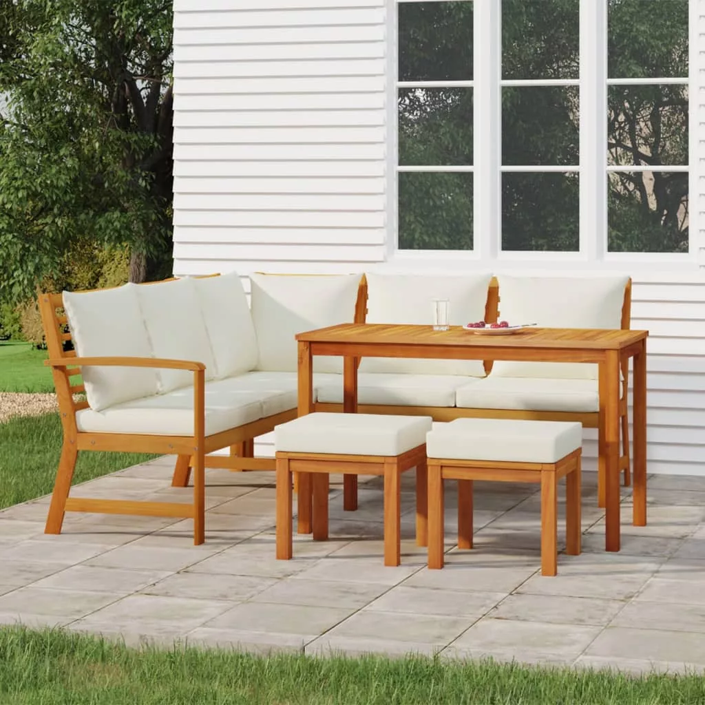 Ez az időtlen dizájnnal rendelkező, párnával ellátott, fából készült kerti étkezőgarnitúra rusztikus bájt kölcsönöz teraszának, kertjének. Tartós anyag: A tömör akácfa egy gyönyörű és természetes anyag. Az akácfa egy trópusi keményfa, amely sűrű erezetű, masszív és tartós.Stabil váz: Az étkezőgarnitúra faváza szilárdságot és stabilitást biztosít.Praktikus asztal: Az asztal helyet biztosít ételek, italok és egyéb dísztárgyak számára.Moduláris kialakítás: Minden darab könnyen mozgatható, ami megkönnyíti az Ön igényeinek megfelelő különböző elrendezések kialakítását. Más, azonos kialakítású és stílusú elemes egységeket is webáruházunkban, hogy kialakíthassa saját bútorgarnitúráját.Kényelmes ülés: A vastagon bélelt hát- és ülőpárnáknak köszönhetően a kültéri étkezőgarnitúra rendkívül kényelmes. Jó tudni:A szerelés megkönnyítése érdekében minden termékhez mellékelünk útmutatót. Megjegyzés:A kültéri bútor szépségének megőrzése érdekében javasoljuk, hogy vízálló huzattal fedje be.Az asztal a megszokott étkezőasztaloknál alacsonyabb, így remekül kombinálható kerti kanapészettekkel. Maximum 110 kg ülésenként.