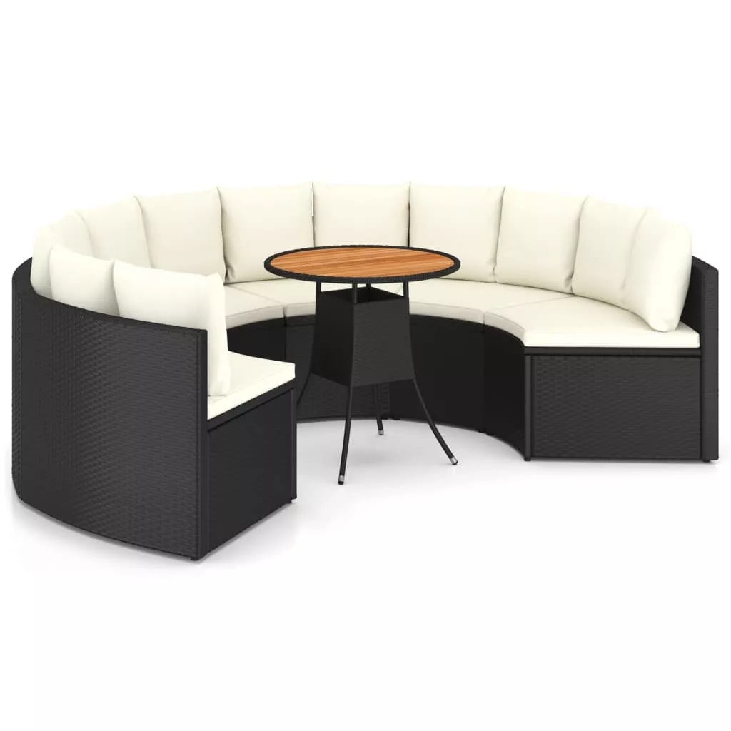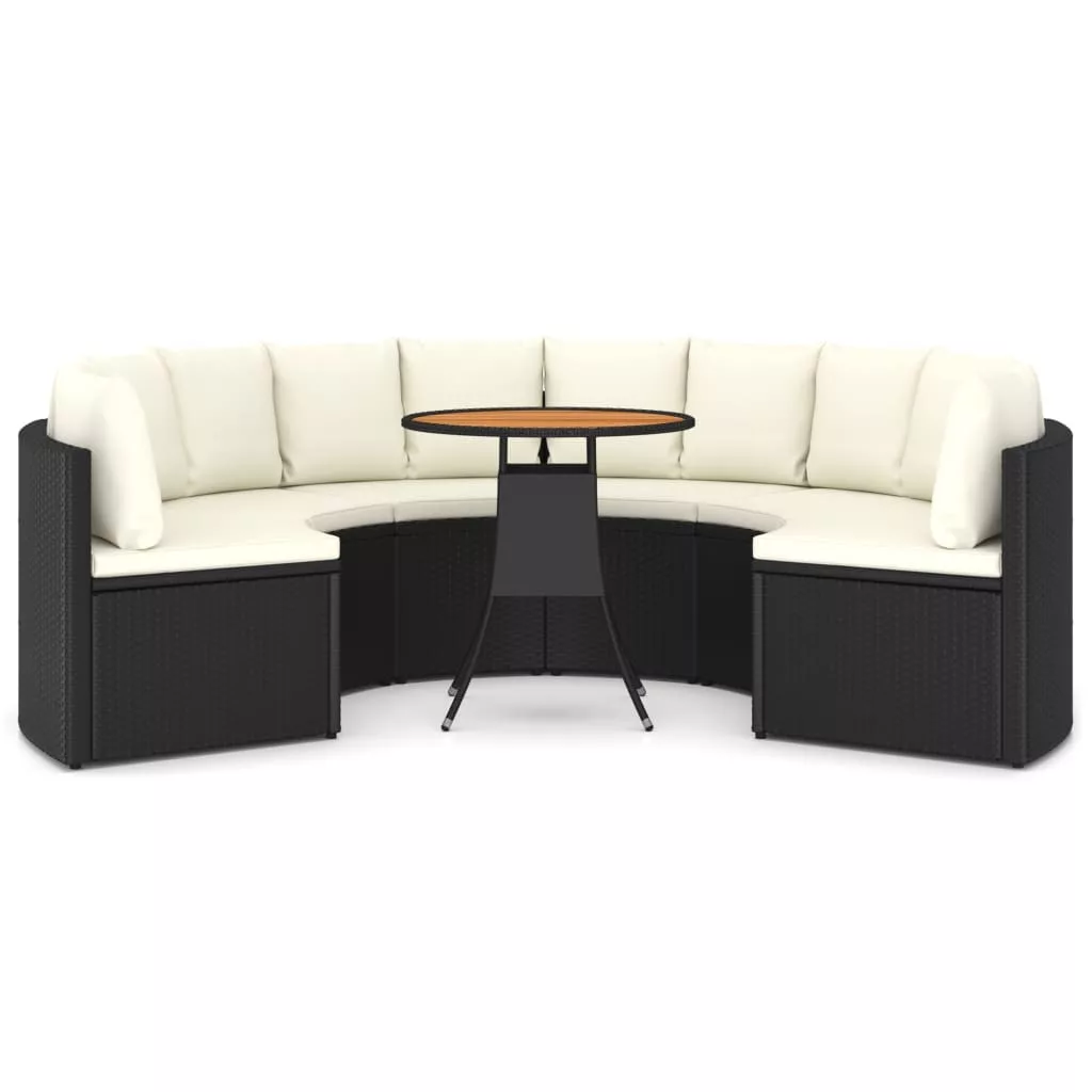 Teremtsen kellemes pihenősarkot ennek a polyrattan kerti bútorgarnitúrának a segítségével! Ez a kényelmes kerti ülőgarnitúra polyrattan bevonatú, porszórt acélvázzal rendelkezik, így strapabíró és könnyen tisztítható. A lécezett asztallap tömör akácfából készült, mely további eleganciát és erőt sugároz. A kanapék legyező alakot formáznak, ezért tökéletesen használhatóak kültere díszítéséhez. Ráadásul a vastag ülő- és hátpárnák a lehető legnagyobb kényelmet nyújtják ülés közben. Könnyű szerkezetének köszönhetően ez a kültéri ülőgarnitúra egyszerűen mozgatható. Figyelem: Hogy a pihenőszett minél tovább kiszolgálja Önt, eső, hó vagy fagy esetén, kérjük takarja le.