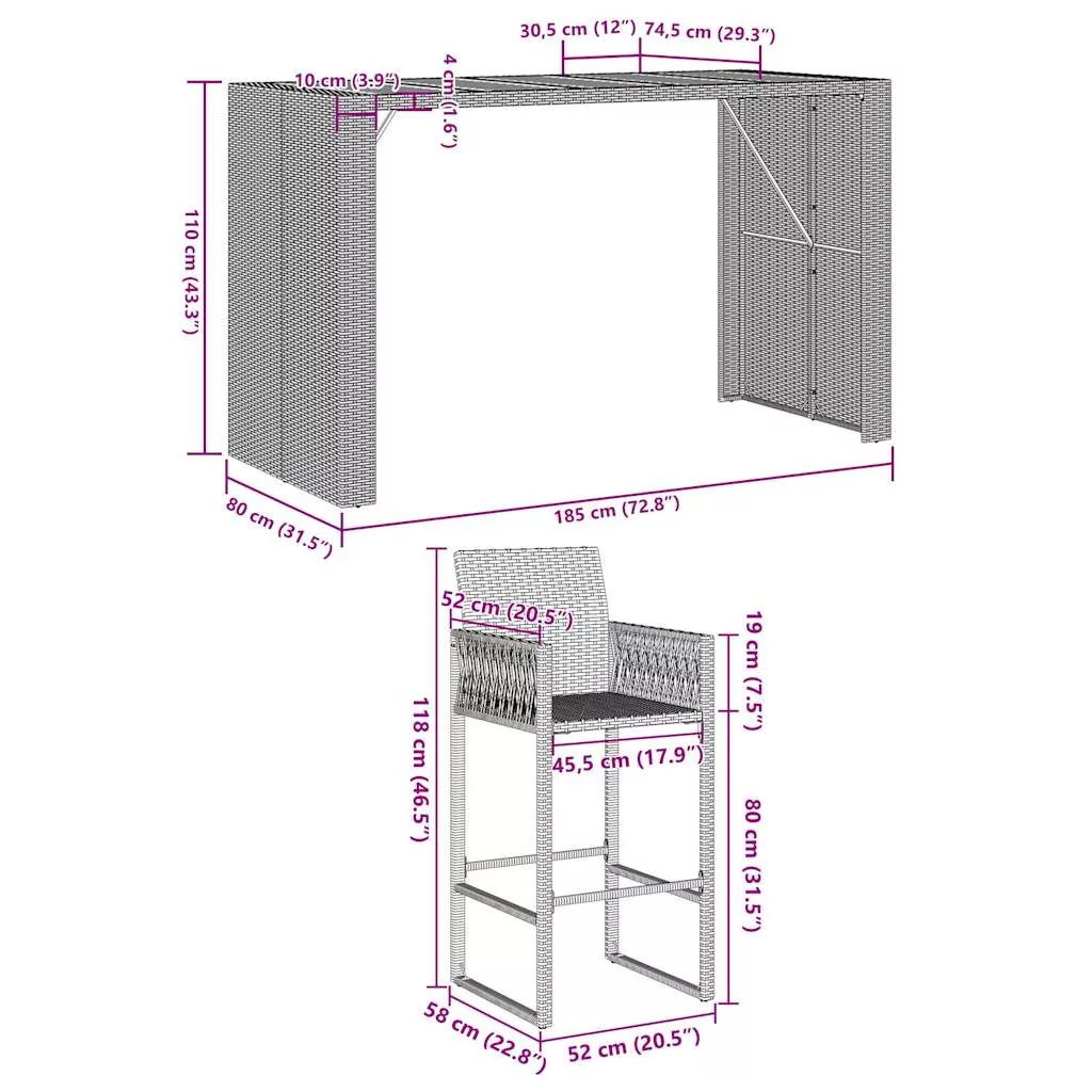 Ez a divatos kerti bárszett, amely egyszerre elegáns és praktikus, garantáltan kertje, udvara vagy bármilyen egyéb környezet központi eleme lesz. Időjárásálló anyag: A PE-rattan, más néven polyrattan, időjárásálló és könnyen tisztítható. Sokáig megőrzi szépségét a szabadban. Kiváló minőséget, kényelmet és esztétikus megjelenést garantál.Kényelmes ülés: A bárszéket háttámasszal és beépített lábtartóval tervezték, hogy kényelmes ülésélményt nyújtson. A vastagon bélelt ülőpárna maximális kényelmet biztosít ülés közben.Erős és stabil váz: A porszórt acélváz masszívvá és stabillá teszi a bárgarnitúrát a mindennapos kültéri használathoz.Széleskörű felhasználás: A különleges kialakítású bárasztal és szék kellemes összképet teremt, és bármilyen környezetbe illik. Jó tudni:A szerelés megkönnyítése érdekében minden termék kézikönyvvel együtt kerül kiszállításra.Megjegyzés:A kültéri bútor szépségének megőrzése érdekében javasoljuk, hogy vízálló huzattal fedje be. Maximum 110 kg ülésenként.