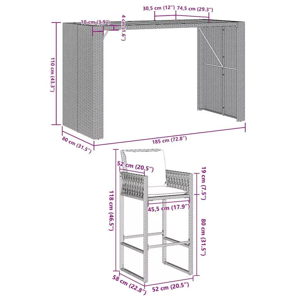 Ez a divatos kerti bárszett, amely egyszerre elegáns és praktikus, garantáltan kertje, udvara vagy bármilyen egyéb környezet központi eleme lesz. Időjárásálló anyag: A PE-rattan, más néven polyrattan, időjárásálló és könnyen tisztítható. Sokáig megőrzi szépségét a szabadban. Kiváló minőséget, kényelmet és esztétikus megjelenést garantál.Kényelmes ülés: A bárszéket háttámasszal és beépített lábtartóval tervezték, hogy kényelmes ülésélményt nyújtson. A vastagon bélelt ülőpárna maximális kényelmet biztosít ülés közben.Erős és stabil váz: A porszórt acélváz masszívvá és stabillá teszi a bárgarnitúrát a mindennapos kültéri használathoz.Széleskörű felhasználás: A különleges kialakítású bárasztal és szék kellemes összképet teremt, és bármilyen környezetbe illik. Jó tudni:A szerelés megkönnyítése érdekében minden termék kézikönyvvel együtt kerül kiszállításra.Megjegyzés:A kültéri bútor szépségének megőrzése érdekében javasoljuk, hogy vízálló huzattal fedje be. Maksimális 110 kg ülésenként. Legyen tudatában a nyílt tűz és más erős hőforrások kockázatának a termék környezetében.