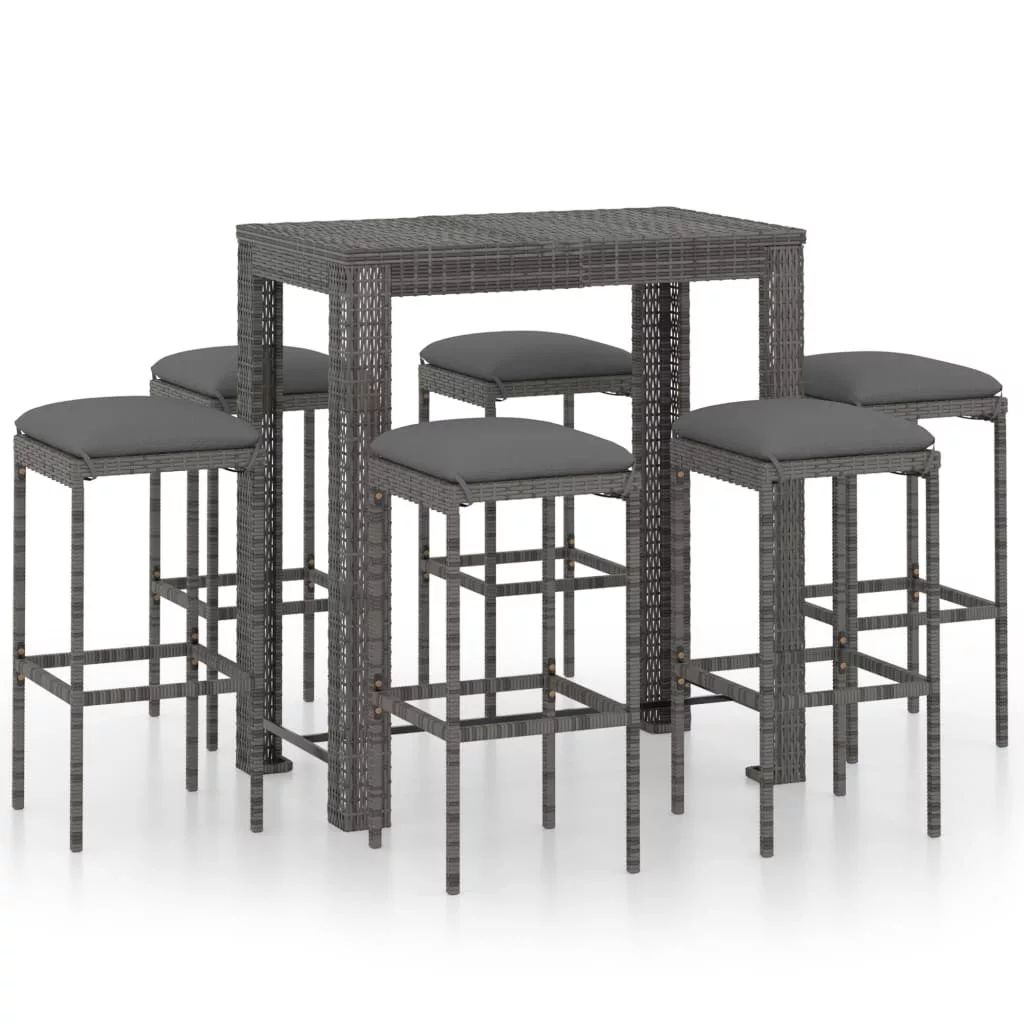 Ez a stílusos kerti bárgarnitúra otthonos és kényelmes pihenést biztosít családtagjai és barátai körében. A bárasztal porszórt acélvázat kapott, így stabil és robusztus. A négyzet alakú asztallap ideális italok, ételek vagy dekoratív holmik tárolásához. A bárszékek szilárd acélvázas szerkezettel rendelkeznek és az időjárás viszontagságainak ellenálló PE rattanból készültek, amelyek kellő stabilitást biztosítanak és így könnyen mozgathatóak. A párna és a lábtartó tovább növelik a bárszékek kényelmét. A rejtett cipzárral ellátott poliészter párnahuzat könnyen tisztítható. Maksimális 110 kg ülésenként. Legyen tudatában a nyílt tűz és más erős hőforrások kockázatának a termék környezetében.