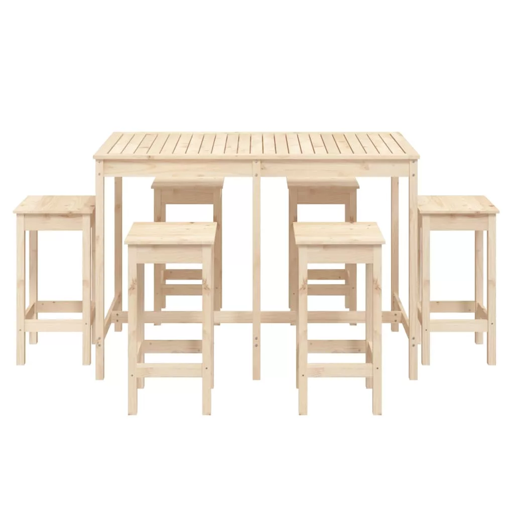 Kortyolgassa kedvenc italát vagy fogyasszon el egy kellemes vacsorát családja vagy barátai társaságában ennél a gyönyörű, fából készült kerti bárszettnél ülve. Tömör fenyőfa: Ez a bárszett tömör fenyőfából készült. A tömör fenyőfa egy gyönyörű, természetes anyag. A fenyőfa egyenes erezetű, a csomók pedig jellegzetes, rusztikus megjelenést biztosítanak az anyagnak.Masszív felső lap: A bárszett bárasztala masszív asztallappal rendelkezik, amely ideális helyet nyújt italok, ételek vagy dísztárgyak számára.Praktikus kialakítás: A fa bárszékeknek nincs háttámlájuk, így bármely oldalukon kényelmesen ülhet, használaton kívül pedig a pult alatt tárolhatja őket.Sokoldalú felhasználás: A minimalista kialakítású udvari bárszett a kert, udvar, erkély stb. bármely sarkába illeni fog. Megjegyzés:A kültéri bútor szépségének megőrzése érdekében javasoljuk, hogy vízálló huzattal fedje be. Maximum 110 kg ülésenként.