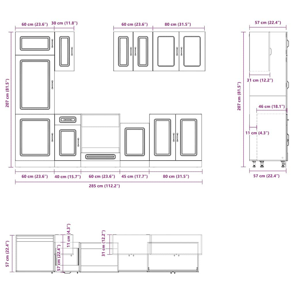 Ez az elegáns kialakítású, nyolcrészes konyhai szekrénygarnitúra optimalizálja konyhája terét, és bőséges tárolóhelyet biztosít személyes tárgyainak! Stabil és tartós anyag: A szerelt fa tartós és stabil anyag sima felülettel, amely ellenáll a nedvességnek, a vetemedésnek és a hasadásnak, így megbízható választás különféle célokhoz.Bőséges tárolóhely: A konyhaszekrénykészlet számos rekesszel rendelkezik, és elegendő helyet kínál tálak, tányérok, edények és egyéb konyhai eszközök tárolására.Állítható lábak: Az alsó szekrények állítható lábakkal rendelkeznek, amelyek magassága a konyha elrendezésének megfelelően állítható.Könnyen karbantartható: A sima felületnek köszönhetően ezek a konyhaszekrények könnyen tisztíthatók nedves ruhával, és kevesebb karbantartást igényelnek. Figyelem:A felborulás elkerülése érdekében ezt a terméket a mellékelt fali rögzítőeszközzel kell használni. Jó tudni:A falon belüli csavar(ok) és dugó(k) nem alaptartozékok. Keressen és használjon a falának megfelelő csavar(oka)t és dugó(ka)t. Ha bizonytalan, kérje szakember tanácsát. Gondosan olvassa el és kövesse a használati utasítás minden lépését.A munkalap, a mosogató és a csaptelep nem tartozéka a szállításnak.