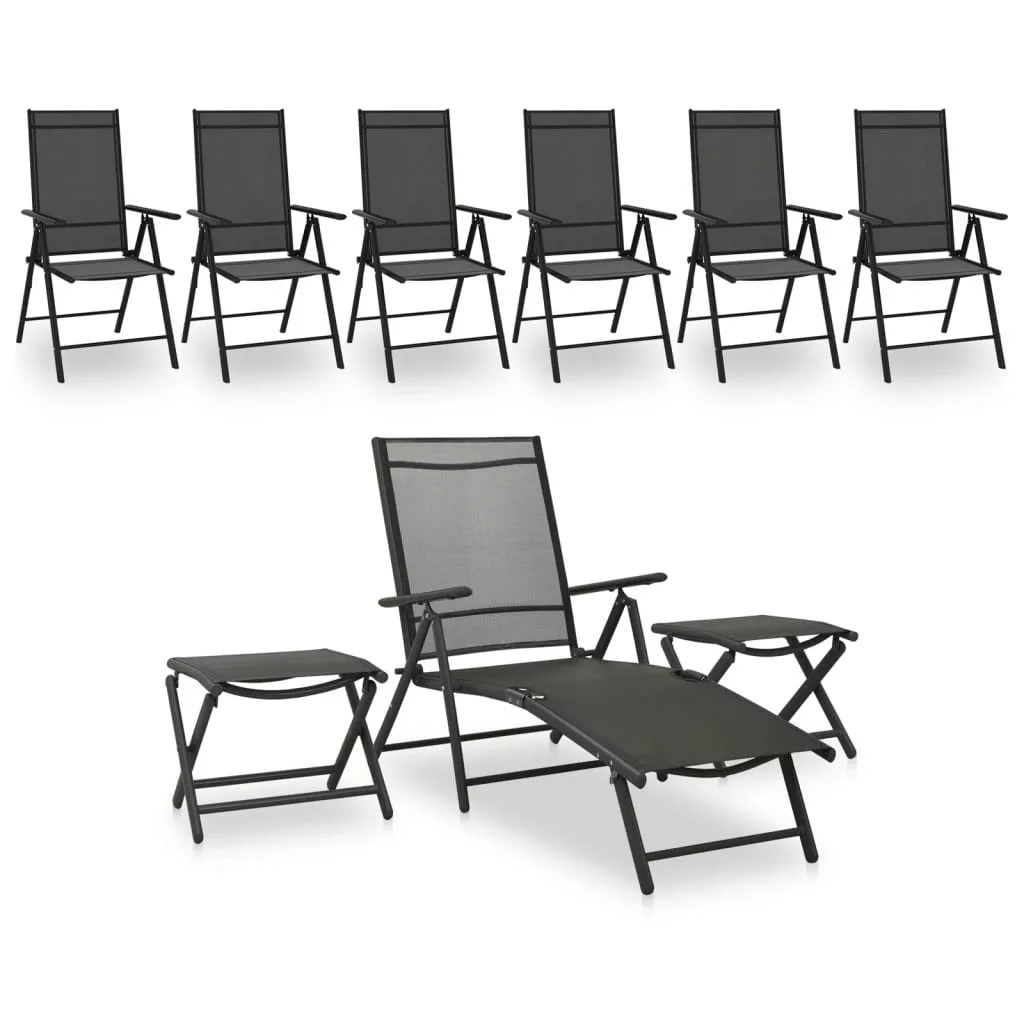 Ebben a stílusos, időtlen dizájnnal rendelkező, összecsukható kerti bútorszettben, minden olyasmi megtalálható, ami biztosítja, hogy ellazulhasson a szabadban. Ez a kültéri bútorgarnitúra alumíniumvázból készült, így könnyűsúlyú és könnyedén hordozható. A székek kényelmesek és légáteresztő textilénből készültek. A székek háttámlája 7-féle fokozatba állítható, így mindig megtalálhatja a legkényelmesebb pozíciót. A lábtartókra feldobhatja a lábát, de akár a gyerekek számára is remek ülőalkalmatosságként funkcionálnak. Használaton kívül minden darab könnyedén összecsukhatók a helytakarékosság érdekében. Megjegyzés: kültéri bútora élettartamának meghosszabbítása érdekében javasoljuk, hogy tisztítsa rendszeresen, és ne hagyja feleslegesen a szabadban, védelem nélkül.Tisztítás: használjon enyhe szappanoldatot.Tárolás: Ha lehetséges, tárolja zárt, hűvös, száraz helyen. Ha a terméket a szabadban tárolja, védje vízálló burkolattal. Eső vagy havazás után törölje le és szárítsa fel a felesleges vizet vagy havat a sima felületekről. Hagyjon elegendő légkeringést a nedvességből eredő károk elkerülése érdekében. Maximum 110 kg ülésenként.