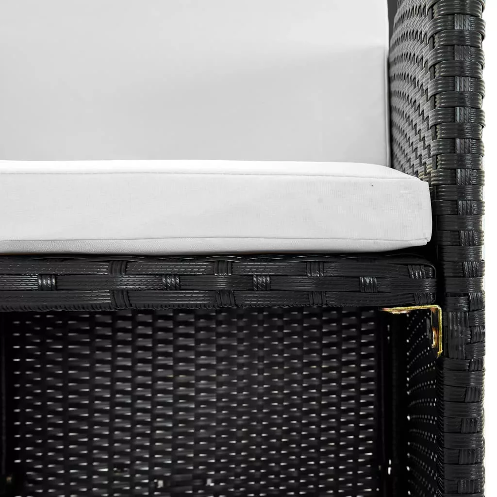 Stílusos rattan kerti bútorgarnitúránk azonnal kertje vagy terasza gyöngyszeme lesz! Ez a rattan étkezőszett elegáns kialakításával tökéletes választás kerti vacsorákhoz vagy pihenéshez. A porszórással felületkezelt acél váznak köszönhetően az asztal, a székek és a puffok is erősek és strapabírók, míg pehelysúlyú szerkezetüknek hála könnyen mozgathatók. Időjárás- és vízálló PE rattan anyagának köszönhetően az étkezőszett könnyedén tisztítható. Az asztal üveglapja egy nedves ronggyal szintén egyszerűen tisztítható. A vastagon párnázott és puha ülések és háttámlák is rendkívül kényelmesek, emellett pedig vízlepergető poliészterből készültek. A huzatok cipzár segítségével leszedhetőek és moshatóak. A szett tartalma: 1 db asztal, 4 db szék, 4 db puff, 12 db párna. Megjegyzés: Eső, hó és fagy esetén javasoljuk, hogy a szettet takarja le.