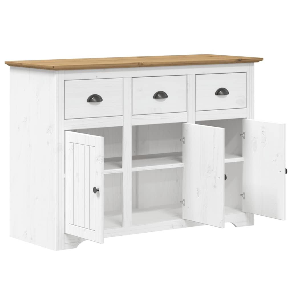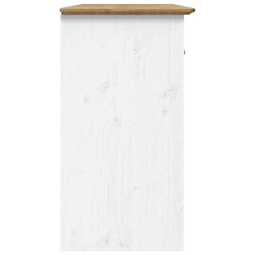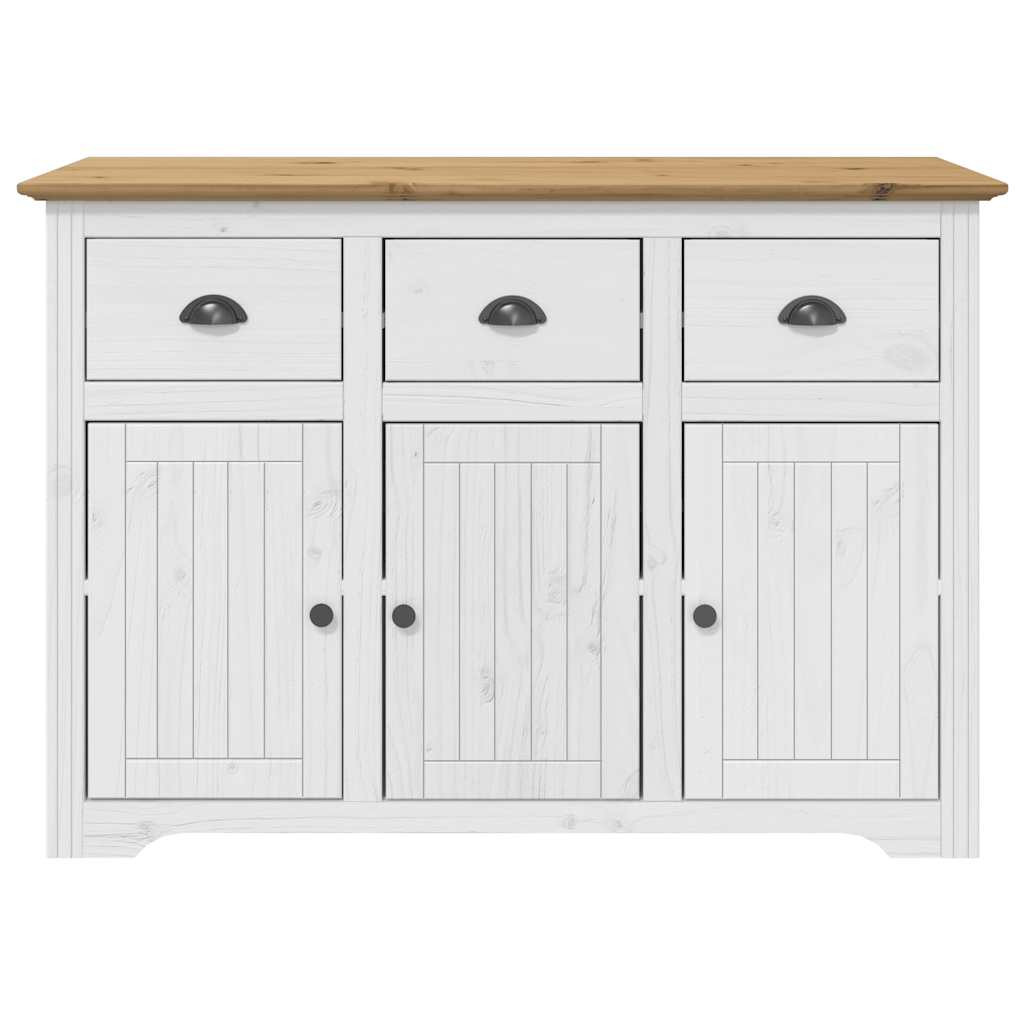 Ez a francia dizájnnal rendelkező klasszikus tálalószekrény kielégíti igényeit és a helyiség kiváló kiegészítője lesz. Tömör fenyőfa: A tömör fenyőfa egy gyönyörű természetes anyag. A fenyőfa erezete egyenes, a csomók pedig jellegzetes, rusztikus megjelenést kölcsönöznek az anyagnak.Bőséges tárolóhely: A szekrény 3 fiókkal és ajtók mögötti rekesszel rendelkezik, így különféle, mindennapi alapvető holmijai jól rendszerezetten, elérhető közelségben tárolhatók.Bemutatófunkció: Kedvenc fotóit, dekorációit vagy virágait is elhelyezheti a tálalószekrény tetején a szoba dekorációjának gazdagítása érdekében.Fémfogantyúk: A konyhaszekrény fémfogantyúi kényelmessé teszik az ajtók nyitását és csukását. Emellett vonzóbbá varázsolják a tárolószekrényt.Bájos francia stílus: Varázsoljon inspiráló francia stílust belső berendezésébe! Figyelem:A felborulás elkerülése érdekében ezt a terméket a mellékelt fali rögzítőeszközzel kell használni.