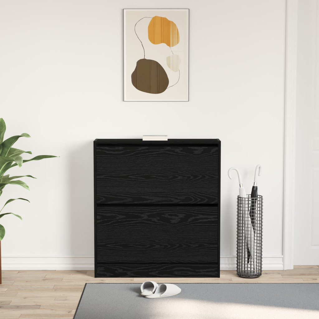 Ez a Kortárs Fekete Tölgy Cipőtartó ötvözi a praktikát és az eleganciát, így szuper választás cipőtárolásra bármilyen beltéri területen. A letisztult fekete tölgy felület és az innovatív dizájn feldobja a hálószobádat vagy az előszobádat, miközben bőven biztosít helyet a cipőidnek.