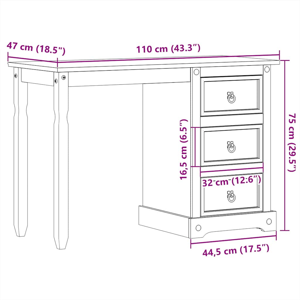 Az egyszerű fa öltözőasztal tökéletes választás hálószobájába. Tömör fenyőfa: A tömör fenyőfa egy gyönyörű természetes anyag. A fenyőfa erezete egyenes, a csomók pedig jellegzetes, rusztikus megjelenést kölcsönöznek az anyagnak.Bőséges tárolóhely: A 3 fiókkal ellátott pipereasztal bőséges helyet biztosít sminkjei, ékszerei és a legfontosabb mindennapi holmijai számára.Fém fogantyúk: A sminkasztal fémből készült gyűrűs fogantyúkkal rendelkezik, amelyek megkönnyítik a fiókok kinyitását és becsukását, miközben tovább növelik szépségét.Széleskörű felhasználás: Ez a fésülködőasztal dolgozóasztalként is használható a dolgozószobában, vagy íróasztalként az irodában. Figyelem:A felborulás elkerülése érdekében ezt a terméket a mellékelt fali rögzítőeszközzel kell használni.