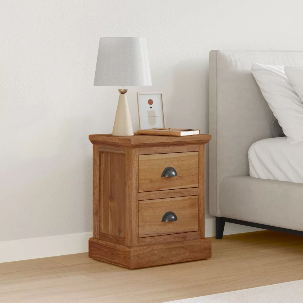 Ez az éjjeli asztal megjelenésében és funkcióiban egyaránt vintage stílusú. Kellemes téglalap formája és természetes tikfa felülete a klasszikus kézművesség jegyeit hordozza. Tökéletesen feldobja a hálószobád, hiszen egyszerre mutatós és praktikus. Mint kis éjjeli szekrény, tökéletes helyet ad éjjeli lámpáknak, ébresztő óráknak vagy a kedvenc cuccaidnak, miközben vintage bája melegséget ad a szobának. Tömör tikfa felépítés Ez az éjjeli asztal tartós tikfából készült, ami biztosítja a hosszú élettartamot és a vonzó külsejét. A természetes erezet és sima felülete egyedi, kézműves minőséget tükröz, biztosítva, hogy a hálószobád dísze legyen. Két simán mozgó fiók A két, tömör tikfából készült fiók rengeteg tárolóhelyet kínál a személyes dolgaidnak. A sima mozgású mechanizmus megkönnyíti a használatát és praktikus megoldást nyújt az esti rutinhoz. Egyszerű, könnyen megfogható fém fogantyúk Minden fiók modern fém fogantyúkkal van felszerelve, amik egyszerűsítik a hozzáférést a tárolt tárgyakhoz. Ezek a fogantyúk ergonómikusak, így az elegancia mellett a praktikát is serválják. Vintage stílus A vintage dizájn visszahozza a múlt hangulatát, miközben modern kényelmetim nabíd. Időtlen stílusa mélységet és karaktert ad a hálószobának, tökéletesen illeszkedik azokhoz, akik szeretik a klasszikus dizájnt. Karbantartási irányelvek Az asztal természetes szépségének megőrzése érdekében kerüld a súrolós tisztítószereket. A rendszeres karbantartás garantálja a felület tartósságát, így az asztal mindig lenyűgöző marad.
