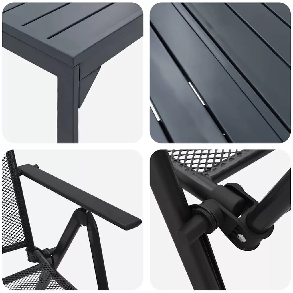 Ez a Modern Kerti Étkezőszett az outdoor étkezés élményét varázsolja új szintre. Stílusos, antracit színével és letisztult formáival tökéletesen illeszkedik kortárs kültéri terekhez, miközben meghitt légkört teremt a kerti összejövetelekhez. A porszórt acél keret diszkrét eleganciát sugároz, és stabil támaszt nyújt az összes étkezéshez. A sok vendéget is kényelmesen elhelyezhető, így ez a szett ideális a családi vacsorákhoz és a szabadtéri eseményekhez, stílust és funkcionalitást egyesítve a különböző környezetekhez. Porszórt acél konstrukció A szett tartós, porszórt acél keretével éri el a hosszú élettartamot és az időjárásnak való ellenállást. Az antracit bevonat modern hatást ad, és a kopástól is megóvja, így szezonról szezonra remekül mutat. Kihúzható asztallap Manunális kiterjesztéssel rendelkezik, több helyet biztosít a nagyobb összejövetelekhez. Sokoldalú funkciója lehetővé teszi, hogy különböző eseményekhez méretben alkalmazkodjon, így akár intimebb vacsorákra, akár családi ünnepekre is használhatod. Kényelmes karfák Ergonomikusan tervezett karfái növelik az ülési kényelmet, így az étkezések mindig pihentetőek. A karfák stílust is adnak, remekül illeszkednek a modern megjelenéshez. Levehető párnák Cipzárral rögzített, könnyen eltávolítható párnákkal jön, így takarításuk egyszerű. Frissítsd fel a szett megjelenését minimális erőfeszítéssel! Időjárásálló ápolás Különleges anyaga biztosítja, hogy bírja a kültéri körülményeket, de ha használaton kívül védőhuzatot használsz, még tovább megőrizheted a szett szépségét az évek során.