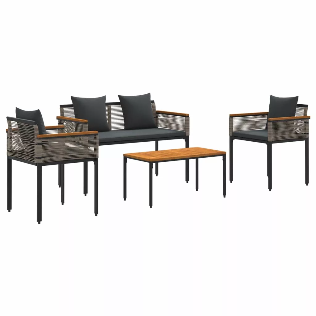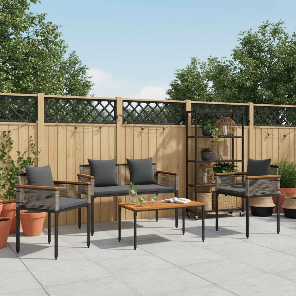 Ez a rusztikus kültéri bútor szett mindenki számára ideális, aki stílusosan szeretne pihenni a természet szépsége között. A természetes, rusztikus dizájn nemcsak a kültéri környezetet egészíti ki, hanem kiválóan mutat azok számára is, akik különleges hangulatot akarnak teremteni a teraszon vagy a kertben. Nagyon sokoldalú, ez a szett tökéletes választás intim baráti találkozókhoz, csendes egyéni pihenéshez, vagy bármilyen olyan eseményhez, ahol egy kis eleganciára van szükség a szabadban. Prémium anyagok: A bútor szett időjárásálló PE rattanból készült, ami garancia a tartósságra. A porbevonatos acél keret extra védelmet nyújt, modern megjelenést biztosítva a rusztikus dizájn mellett. Sokoldalú alkatrészek: A faragott fa kartámaszok kényelmesek és elegánsak. A dobozos párnák cserélhető cipzáras huzattal garantálják a könnyű karbantartást, miközben kellemes ülőhelyet kínálnak. Praktikus design: Az állítható lábak biztosítják a bútor stabilitását egyenetlen terepen is, így tökéletes bármilyen kültéri helyszínre, legyen az fű vagy beton. Ajánlott használat: Ideális teraszokhoz, kertekhez, és más kültéri helyszínekhez; a szett támogatja a pihentető vagy éppen ellenkezőleg, élénk találkozókat. Rusztikus varázsa minden természetes környezethez stílust és praktikát ad. Karbantartási útmutató: Használjon vízálló huzatot, amikor a szett nincs használatban, hogy megvédje a bútorokat. Az egyszerű száraz törlés megkönnyíti a tisztítást; kerülje az erős vegyszereket a felület megóvása érdekében.