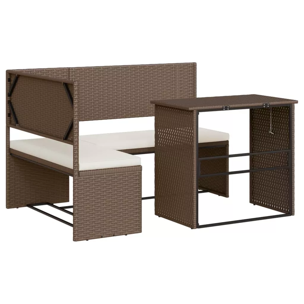 L-alakú barna polyrattan kerti kanapé asztallal és párnákkal