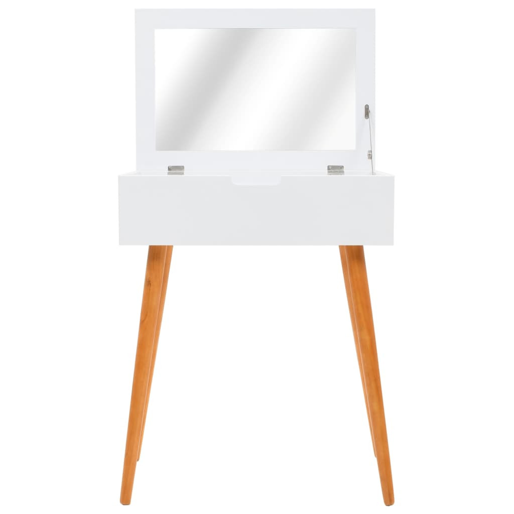 Ez az öltözőasztal nagyszerű kiegészítője lehet hálószobájának vagy öltözőjének sikkes dizájnjának és letisztult fehér felületének köszönhetően. Az asztal MDF-ből készült, és egy tükörrel lett ellátva. A panelt megemelve egy tükör és méretes ékszertartók állnak a használó rendelkezésére. Bőséges helyet kínál kozmetikumok, illetve haj- és bőrápoló termékek tárolásához. Ha nem használja épp a tükröt, az asztallap ideális helyet biztosít a különböző sminkek, ékszerek és szépségápolási cikkek számára. A masszív falábak hozzájárulnak az asztal stabilitásához, illetve az '50-es, 60-as éveket idéző dizájnjához. Könnyen összeszerelhető.