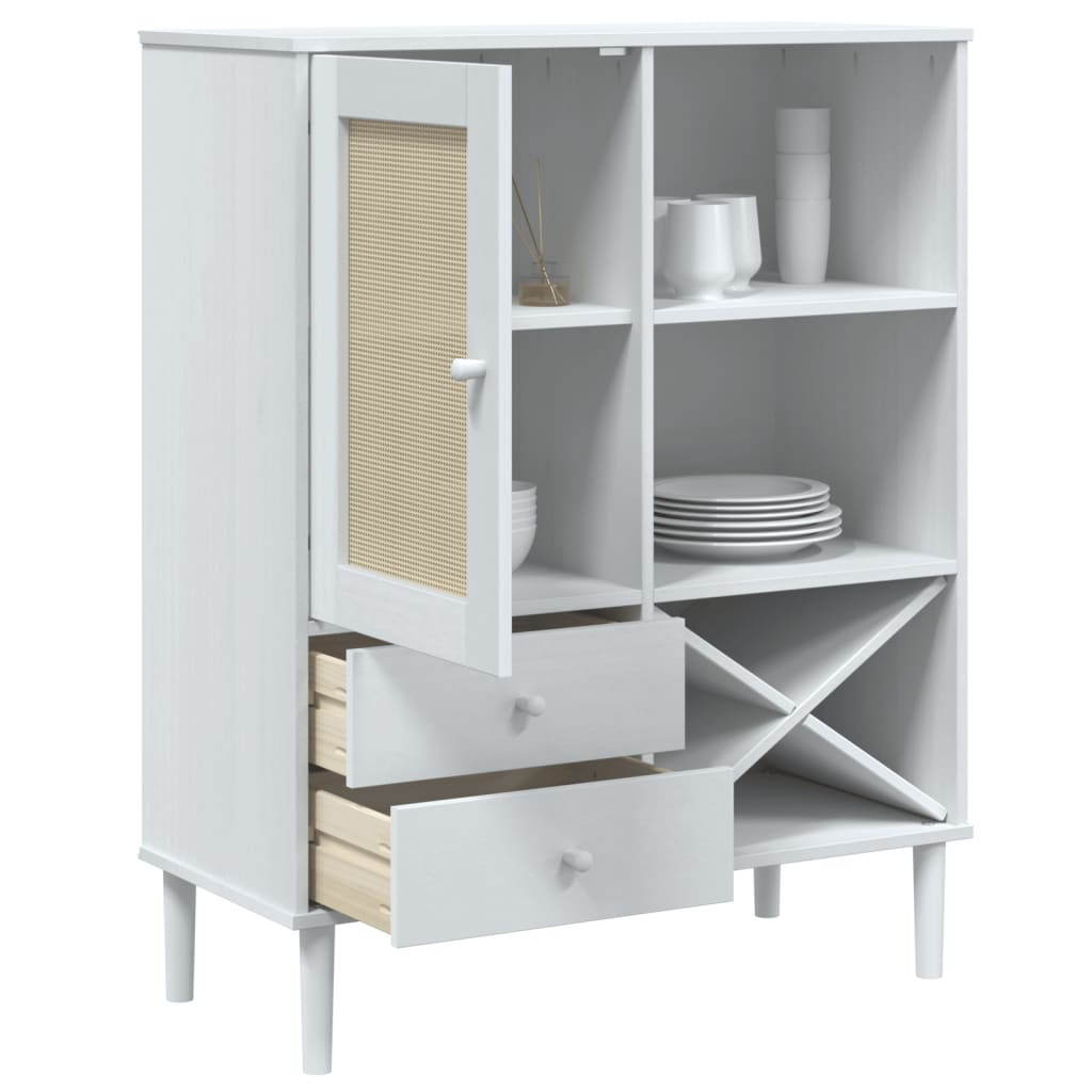 Stílusos magasszekrényt keres? Ez a fa magasszekrény egyedi bájt kölcsönöz meglévő belső terének! Tömör fenyőfa: A tömör fenyőfa egy gyönyörű természetes anyag. A fenyőfa erezete egyenes, a csomók pedig jellegzetes, rusztikus megjelenést kölcsönöznek az anyagnak.UV-lakk: Az UV-lakk egy speciális lakktípus, amely ultraibolya-szárítógéppel készül. Élénkebb, fényűzőbb és tapinthatóbb felületet hoz létre a nem UV-lakkokhoz képest.Bőséges tárolóhely: Ez a kisszekrény két fiókkal és több rekesszel rendelkezik, így bőséges helyet biztosít folyóiratai, könyvei, DVD-i, multimédiás eszközei és egyéb alapvető holmijai kézközelben történő rendezett tárolásához.Rattanhatású felület: A magasszekrény ajtajának felülete kézzel készült polirattanból, amely a századközép modern és bohém stílusainak kéttónusú keveréke, amely hangulatos, mégis elegáns megjelenést visz otthonába.Stabil lap: A masszív lap tökéletes helyet nyújt cserepes növények, képkeretek és egyéb dísztárgyak elhelyezésére. Figyelem:A felborulás elkerülése érdekében ezt a terméket a mellékelt fali rögzítőeszközzel kell használni.