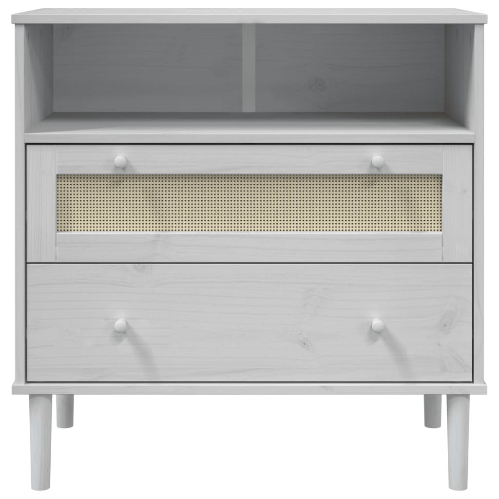 Ez a minimalista bájjal rendelkező fa tálalószekrény megfelel tárolási igényeinek, és egyedi megjelenést visz a helyiségbe. Tömör fenyőfa: A tömör fenyőfa egy gyönyörű természetes anyag. A fenyőfa erezete egyenes, a csomók pedig jellegzetes, rusztikus megjelenést kölcsönöznek az anyagnak.UV-lakk: Az UV-lakk egy speciális lakktípus, amely ultraibolya-szárítógéppel készül. Élénkebb, fényűzőbb és tapinthatóbb felületet hoz létre a nem UV-lakkokhoz képest.Bőséges tárolóhely: Ez a kisszekrény két fiókkal és egy rekesszel rendelkezik, így bőséges helyet biztosít folyóiratai, könyvei, DVD-i, multimédiás eszközei és egyéb alapvető holmijai kézközelben történő rendezett tárolásához.Rattanhatású felület: A tárolószekrény fiókjának elülső felülete kézzel készült polirattanból, amely a századközép modern és bohém stílusainak kéttónusú keveréke, amely hangulatos, mégis elegáns megjelenést visz otthonába.Stabil lap: A masszív lap tökéletes helyet nyújt cserepes növények, képkeretek és egyéb dísztárgyak elhelyezésére. Figyelem:A felborulás elkerülése érdekében ezt a terméket a mellékelt fali rögzítőeszközzel kell használni.