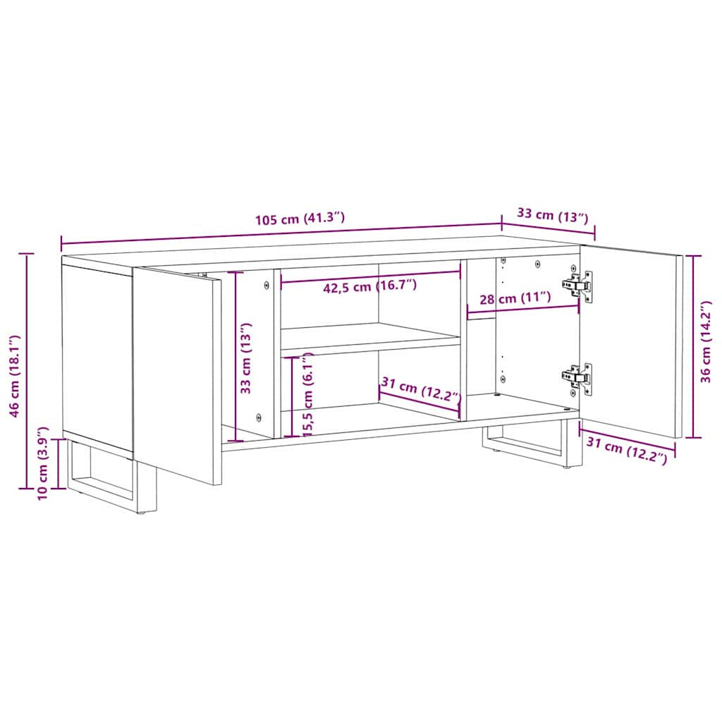 Ez a Rusztikus TV Szekrény összpontosít a tömör mangófa természetes megjelenésére és a praktikus tárolásra, így stílusos választás bármilyen modern otthonhoz. Az egyszerű téglalap alakja könnyen illeszkedik bármilyen térbe, eo a rusztikus bájt árasztja a texturált fa és a hullámos minták által, ami kellemes és barátságos hangulatot teremt. A fekete vas lábak modern érintést adnak, miközben stabilan tartják. Képzeld el, hogy ez a nappalid fénypontja, szuper jó a médiádnak vagy mint a díszelem a dekorációdnak. Anyagok: Tömör mangófából készült, ez a TV szekrény jól mutat a szép erezetével és erős felépítésével. Hosszú távon is kitart, megőrizve a rusztikus báját. Adj egy kis eleganciát az otthonodnak ezzel a gazdag, meleg tónusú fával, ami tökéletes keveréke a szépségnek és megbízhatóságnak. Tartalom: A szekrény rengeteg tárolóhellyel bír, zsanéros ajtókkal, amik sok polc helyet kínálnak, jól használható a média kiegészítők rendben tartására. A deszkapolcok masszívak és bármilyen elektronikai eszközt és dísztárgyat elbírnak. Minden részlet a praktikumra van kitalálva, míg a rusztikus megjelenéssel harmonizál. Jellemzők / Funkció / Dizájn: Mindennapi használatra készült, ez az egység robusztus elemekkel bír, amik jól bírják a kopásokat, biztosítva a tartós minőséget. Az anyagok és textúrák mixe látványos hatást kelt, ami kiemelkedik, és tárolási megoldásokat kínálva extra dekorációt ad a nappalidnak. Ajánlott használat: Tökéletes a nappaliban, ez a szekrény nem csak tárolási megoldás, hanem dizájnnyilatkozat is. Ideális DVD-k, távirányítók, konzolok és sok más számára, könnyedén illeszkedik mind a klasszikus, mind a modern berendezésekhez a sokoldalú stílusa miatt. Karbantartás és ápolás: Tartsd karban a szekrényt, rendszeresen portalanítva egy puha, száraz ruhával. Nézd meg a szerviz utasításokat a sima összeszereléshez szükséges eszközökkel. Egy kis rendszeres ápolás segít megőrizni a vonzerejét évekig.