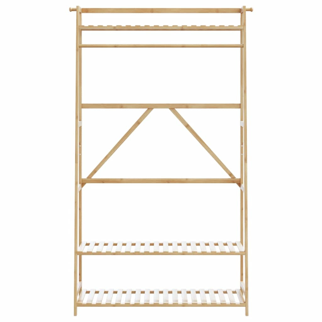 A bambusz ruhatartó természetes megoldást kínál a helyiségek rendszerezésére, a praktikus dizájnt és a robusztus funkcionalitást ötvözve. Stabil és tartós: A bambusz könnyű, vízálló és erős, így kiváló választás különféle alkalmazásokhoz, beleértve a bútorkészítést, az építőipart, a kézműves és a dekorációs tárgyakat.Bőséges tárolóhely: A ruhatár a ruhák rendszerezésére szolgáló akasztórúddal rendelkezik, amely biztosítja, hogy minden könnyen elérhető legyen. A polcok ideálisak dobozok és összehajtogatott ruhadarabok tárolására, míg az alsó polc cipőknek biztosít helyet. Ezenkívül az oldalsó kampók kényelmes helyet biztosítanak a kézitáskák és kalapok felakasztásához.Sokoldalú használat: A ruhatartó különböző terekhez igazodik, akár a fürdőszobában törölközőtartóként, akár az előszobában kabáttartóként, akár a hálószobában vagy az öltözőben ruhatartóként, táskatartóként és így tovább.Könnyen karbantartható: A bambusz ruhatartó könnyen tisztítható nedves ruhával, és kevesebb karbantartást igényel.