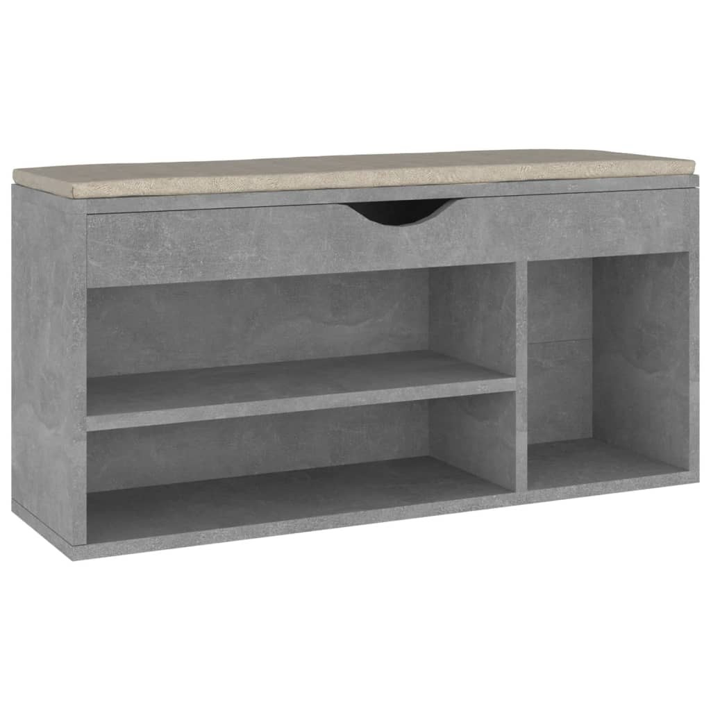 betonszürke szerelt fa cipőtároló pad párnával 104 x 30 x 49 cm