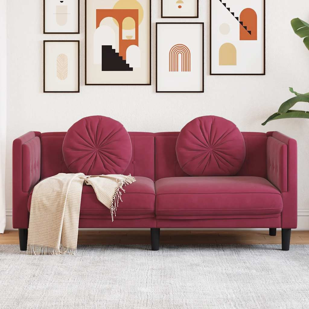 bordó bársony kétszemélyes kanapé párnákkal