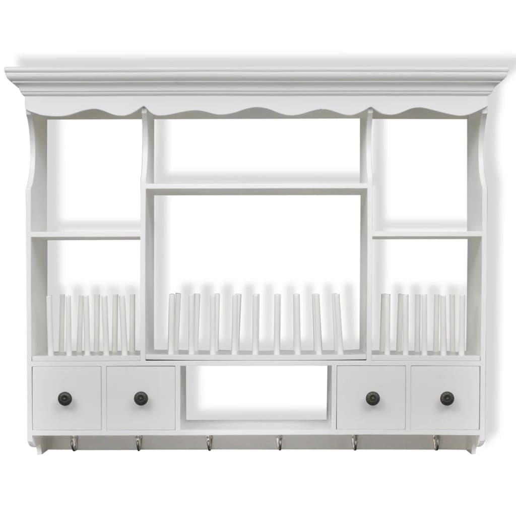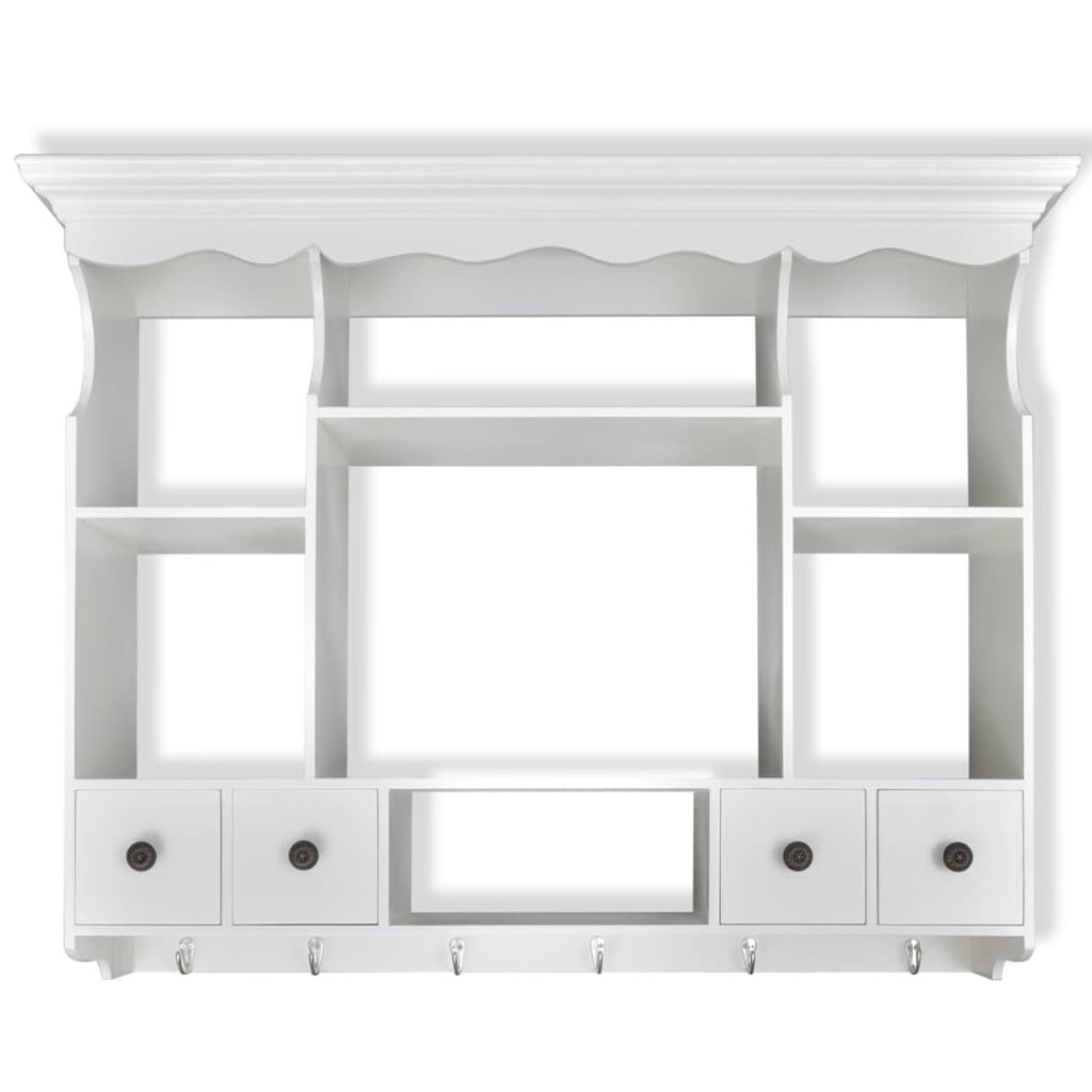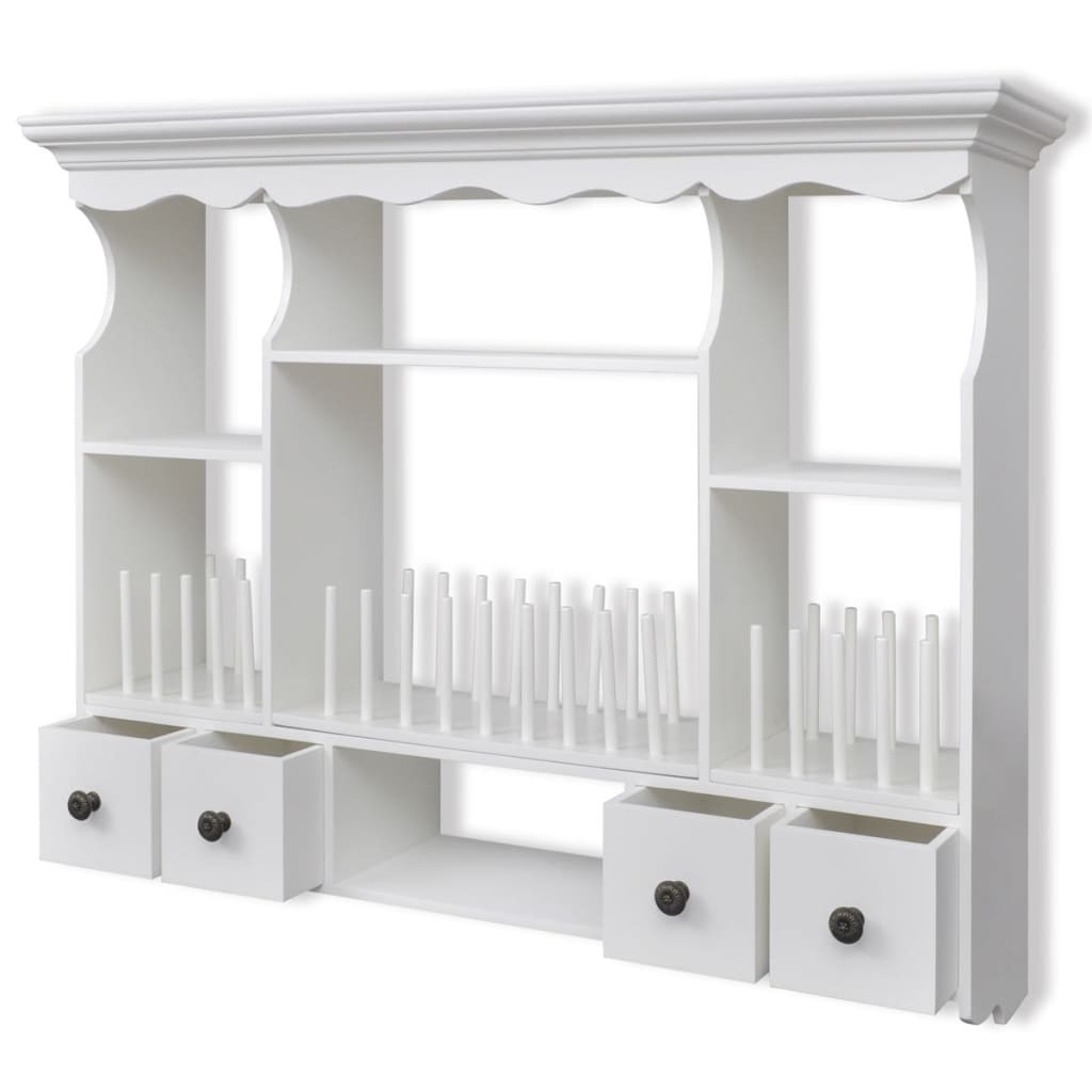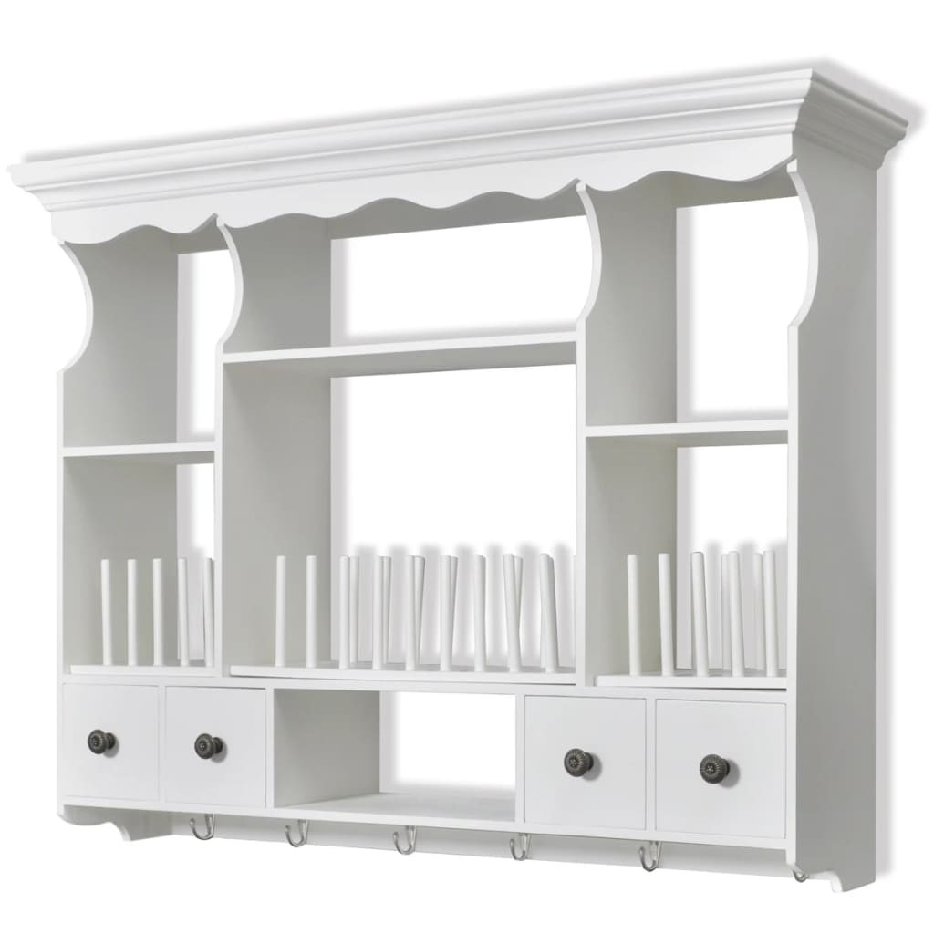 Ez az elegáns, antik megjelenésű, fából készült faliszekrény rengeteg tárolási és szervezési lehetőséget kínál gyakorlatilag minden konyhában, és segít a konyhája rendezetten tartásában. A szekrény négy fiókkal és négy polccal rendelkezik, így könnyen tárolhat gabonaféléket, fűszereket, konzerveket és még sok mást. A szegek a helyükön tartják a tányérokat és az edényeket. A fiókok könnyen kinyithatók, így gyorsan beszerezheti a szükséges dolgokat. Kampókkal lett felszerelve, bögrék vagy törlők felakasztására. Kiváló minőségű fából készült, ezt a szekrényt úgy tervezték, hogy ellenálljon a nedves környezetnek. A fehérre festett felület nedves ruhával könnyedén tisztítható.