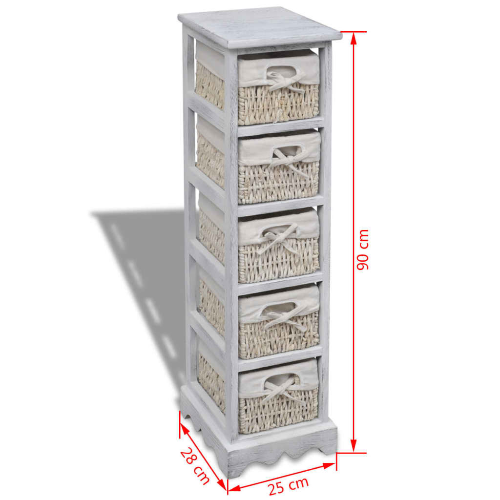 fehér fa tárolóállvány 5 szőtt kosárral