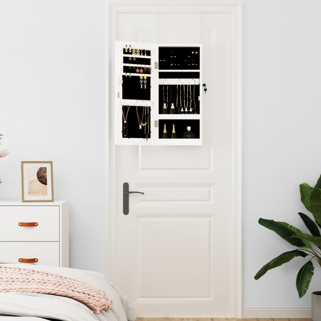 Tartsa távol ékszereit és parfümjeit diszkréten és elegánsan ezzel a stílusos tükrös ékszertartóval! Tartós anyag: A szerelt fa kivételes minőségű, sima felületű, szilárd, stabil, és ellenáll a nedvességnek. A szerelt fából készült ékszerszekrény könnyen tisztítható nedves ruhával. Bőséges tárolóhely: A tárolótükör rengeteg kampót, akasztót és polcot kínál, hogy ékszereit rendezetten és elérhető helyen tartsa.Praktikus tükör: A praktikus tükörrel ez az ékszerrendező kiválóan alkalmas készülődéshez és sminkeléshez.Megfontolt védelem: Az ékszertároló zárható ajtóval és 2 kulccsal rendelkezik, hogy biztosítsa a tárgyak biztonságát. Ezenkívül a belső puha szövethuzat nemcsak eleganciát ad, hanem megóvja szeretett ékszereit a karcolásoktól.Helytakarékos kialakítás: Akassza fel a tükrös ékszerdobozt az ajtó fölé a mellékelt kampókkal, vagy szerelje fel a falra, hogy helyet takarítson meg. Jó tudni:A falra szereléshez szükséges csavarok mellékelve vannak.
