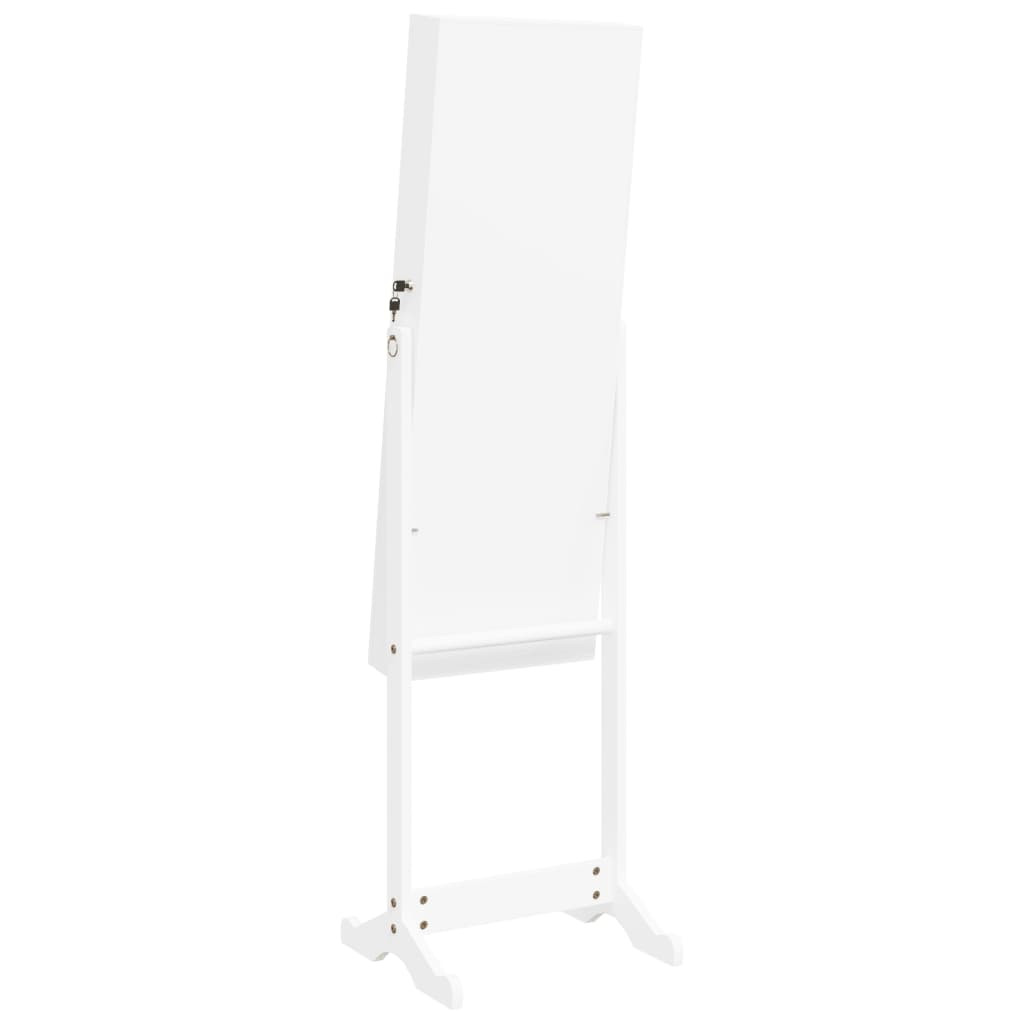 Tartsa távol ékszereit és parfümjeit diszkréten és elegánsan ezzel a stílusos, LED fényekkel ellátott, tükrös ékszertartóval! Tartós anyag: A szerelt fa kivételes minőségű, sima felületű, szilárd, stabil, és ellenáll a nedvességnek. A szerelt fából készült ékszerszekrény könnyen tisztítható nedves ruhával.Bőséges tárolóhely: A tárolótükör 2 fiókot és rengeteg kampót, akasztót és polcot kínál, hogy ékszereit rendezetten és elérhető helyen tartsa.Állítható tükör: A teljes hosszúságú tükör nagy felbontású, és tisztán visszatükrözi az egész testet, deformáció nélkül. A legfontosabb, hogy a tükör szabadon elforgatható 3 különböző pozícióba, így különféle szögekből örökítheti meg szépségét.Megfontolt védelem: Az ékszertároló zárható ajtóval és 2 kulccsal rendelkezik, hogy biztosítsa a tárgyak biztonságát. Ezenkívül a belső puha szövethuzat nemcsak eleganciát ad, hanem megóvja szeretett ékszereit a karcolásoktól.Kényelmes LED-lámpák: A belső rész tetején található LED-lámpák az ajtó kinyitásakor automatikusan bekapcsolnak, hogy segítsenek megtalálni ékszereit.Szabadon álló dizájn: Ez a szabadon álló ékszerszekrény könnyen elhelyezhető bárhol a hálószobában, a nappaliban és azon túl is. A kétlábú talapzat pedig kiegyensúlyozottan és stabilan tartja ezt a tükrös ékszerdobozt, még akkor is, ha belseje meg van pakolva. Figyelem:A felborulás elkerülése érdekében ezt a terméket a mellékelt fali rögzítőeszközzel kell használni. Jó tudni:3 darab AA elem szükséges, de a csomag nem tartalmazza. Ne használja ezt az elemet, ha valamelyik alkatrésze eltört, elszakadt vagy hiányzik.