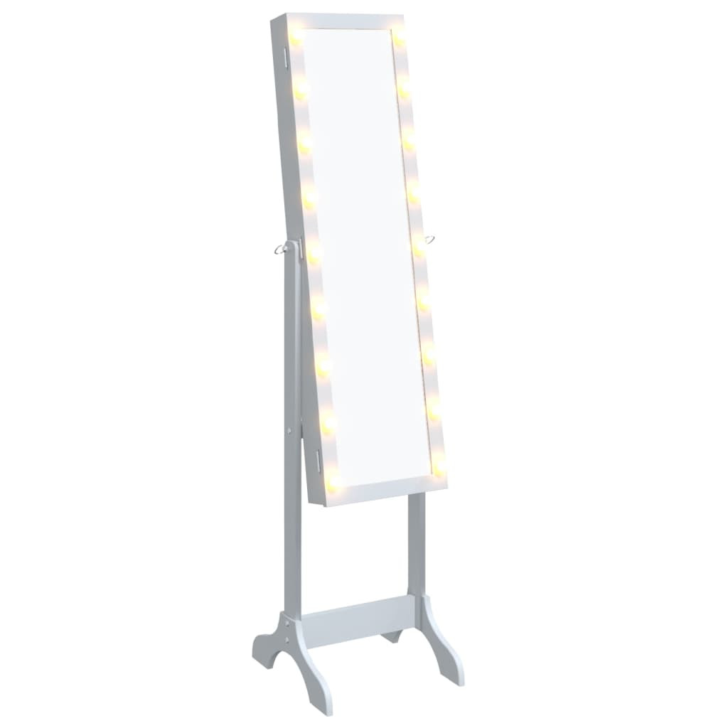 Ez a LED-del ellátott szabadon álló tükör elegáns kialakításával nagyszerű dekorációs kiegészítője lesz előszobájának, hálószobájának, öltözőjének, ruhatárának stb. Tartós anyag: A szerelt fa kivételes minőségű, sima felületű, szilárd, stabil, és ellenáll a nedvességnek.LED-lámpák: A tükör körüli LED-izzók megvilágítják az Ön szépségét.Tiszta kép: Az üveg tükörfelület tiszta képet biztosít. Így gyönyörűen és természetesen láthatja magát, amikor a sminktükör előtt áll.További tárhely: Ez az álló tükör bőséges tárolóhelyet kínál a tükör mögött, hogy könnyen hozzáférhessen a dolgaihoz.Egyedi dekoráció: Az állótükör azonnal eleganciát, csillogást és romantikát kölcsönöz beltéri életterének.