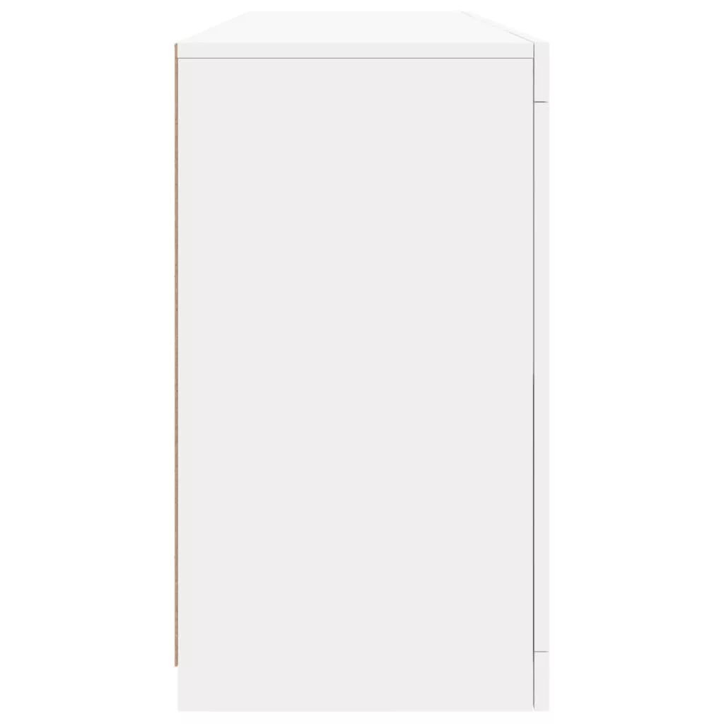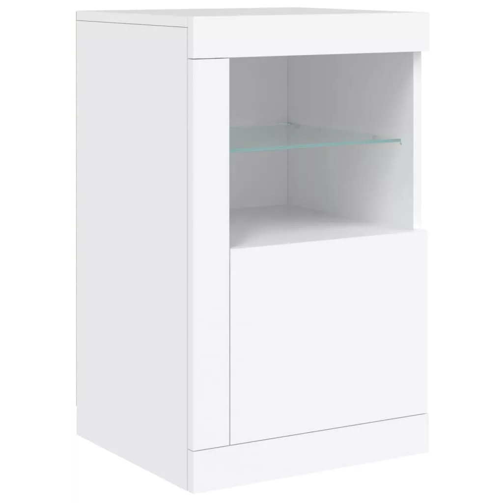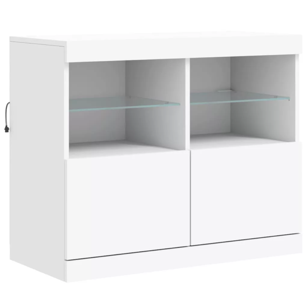 Díszítse fel szobáját ezzel a modern, LED-es lámpákkal felszerelt tálalószekrénnyel, mely könnyedén beleolvad otthona bármely stílusához. Tartós anyag: A szerelt fa kivételes minőségű, sima felületű, szilárd, stabil, és ellenáll a nedvességnek.RGB LED-világítás: A tálalószekrény élénk RGB LED-világítással lett felszerelve. A sokféle testre szabható menü segítségével egyszerűen megváltoztathatja a világítás színét, sőt, automatikus váltakozást is beállíthat. Ezek a LED-lámpák nemcsak a tálalószekrény modern megjelenését, de divatosságát is növelik.Bőséges tárolóhely: A tárolószekrény rengeteg helyet kínál mindennapi tárgyainak rendezett és könnyen elérhető tárolására.Bemutatófunkció: Az előszobaszekrény masszív lapja ideális dísztárgyak, képkeretek és cserepes növények elhelyezésére.Praktikus ajtók: Tartsa pormentesen legfontosabb dolgait a kisszekrény ajtajai mögé rejtve őket. Jó tudni:A termék USB-csatlakozóval rendelkezik, amelyhez hitelesített, 5 V-os USB áramforrás szükséges (nem alaptartozék). Figyelem:A felborulás elkerülése érdekében ezt a terméket a mellékelt fali rögzítőeszközzel kell használni. Ne használja ezt az elemet, ha valamelyik alkatrésze eltört, elszakadt vagy hiányzik. Ez a termék DC 5V-ról működik, de a tanúsított 5V-os USB-tápforrást nem tartalmazza. A magasabb feszültség túlmelegedést okozhat, és a készülék károsodását, valamint a túlmelegedés és a tűz lehetséges kockázatát okozhatja.