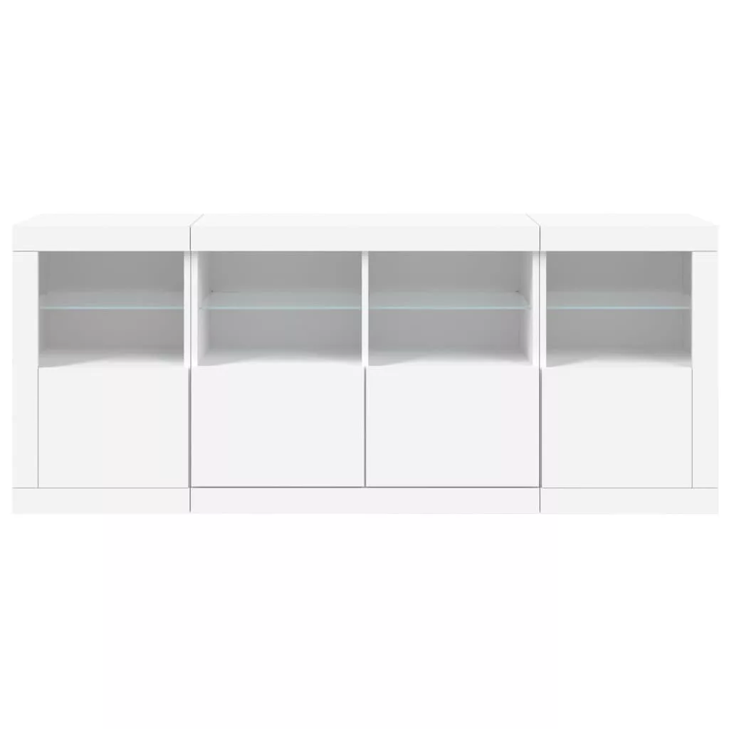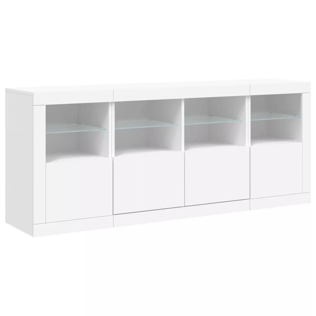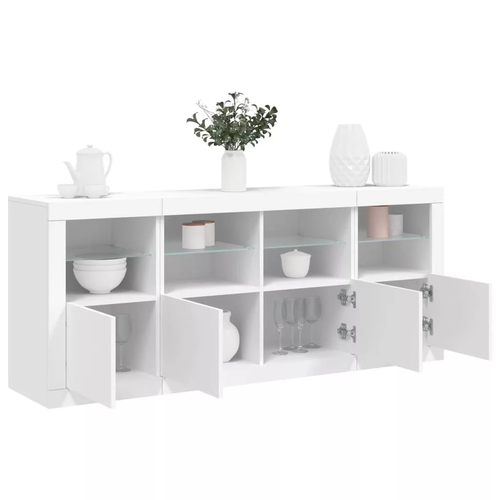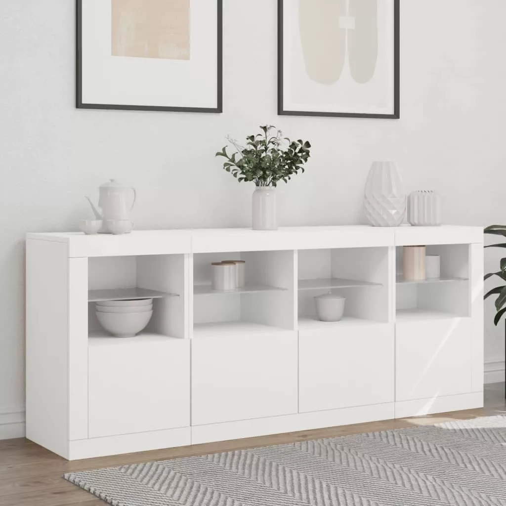 Díszítse fel szobáját ezzel a modern, LED-es lámpákkal felszerelt tálalószekrénnyel, mely könnyedén beleolvad otthona bármely stílusához. Tartós anyag: A szerelt fa kivételes minőségű, sima felületű, szilárd, stabil, és ellenáll a nedvességnek.RGB LED-világítás: A tálalószekrény élénk RGB LED-világítással lett felszerelve. A sokféle testre szabható menü segítségével egyszerűen megváltoztathatja a világítás színét, sőt, automatikus váltakozást is beállíthat. Ezek a LED-lámpák nemcsak a tálalószekrény modern megjelenését, de divatosságát is növelik.Bőséges tárolóhely: A tárolószekrény rengeteg helyet kínál mindennapi tárgyainak rendezett és könnyen elérhető tárolására.Bemutatófunkció: Az előszobaszekrény masszív lapja ideális dísztárgyak, képkeretek és cserepes növények elhelyezésére.Praktikus ajtók: Tartsa pormentesen legfontosabb dolgait a kisszekrény ajtajai mögé rejtve őket. Jó tudni:A termék USB-csatlakozóval rendelkezik, amelyhez hitelesített, 5 V-os USB áramforrás szükséges (nem alaptartozék). Figyelem:A felborulás elkerülése érdekében ezt a terméket a mellékelt fali rögzítőeszközzel kell használni. Ne használja ezt az elemet, ha valamelyik alkatrésze eltört, elszakadt vagy hiányzik. Ez a termék DC 5V-ról működik, de a tanúsított 5V-os USB-tápforrást nem tartalmazza. A magasabb feszültség túlmelegedést okozhat, és a készülék károsodását, valamint a túlmelegedés és a tűz lehetséges kockázatát okozhatja.
