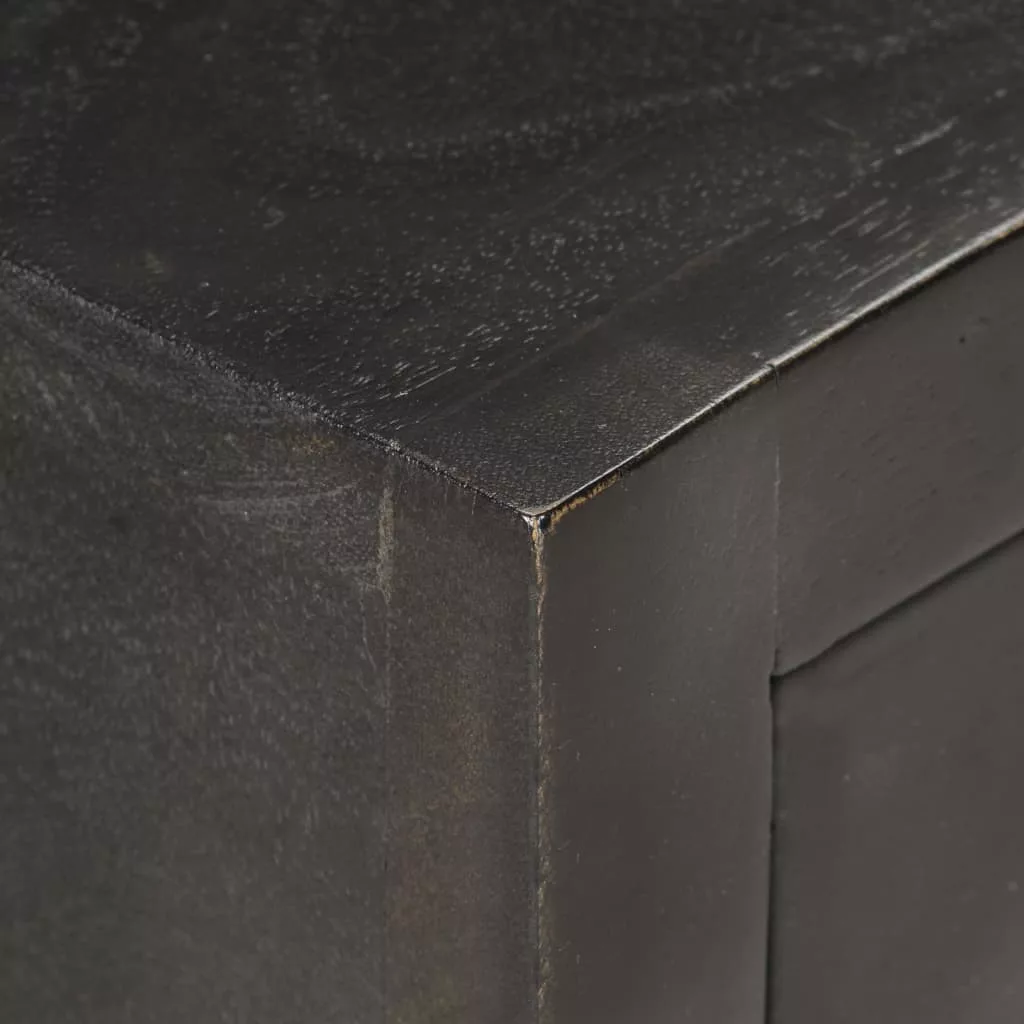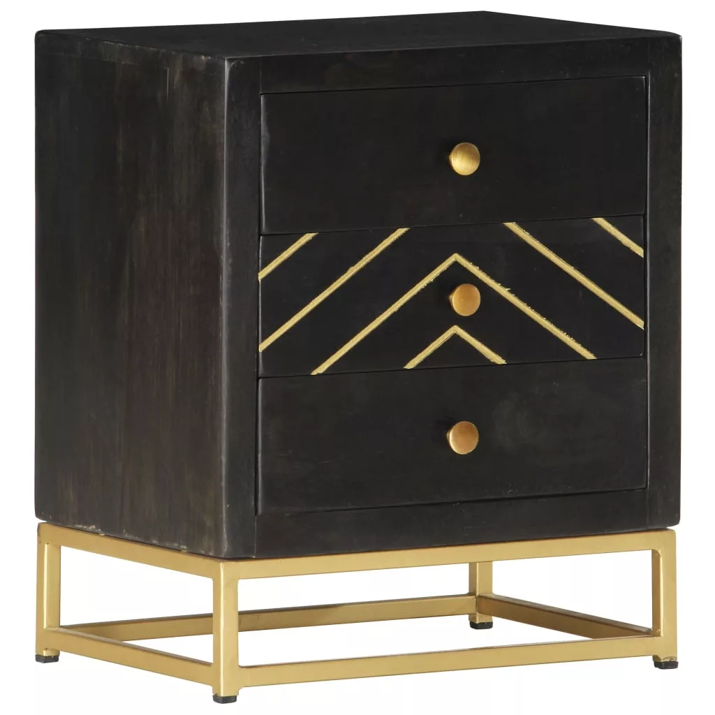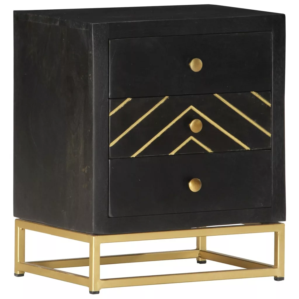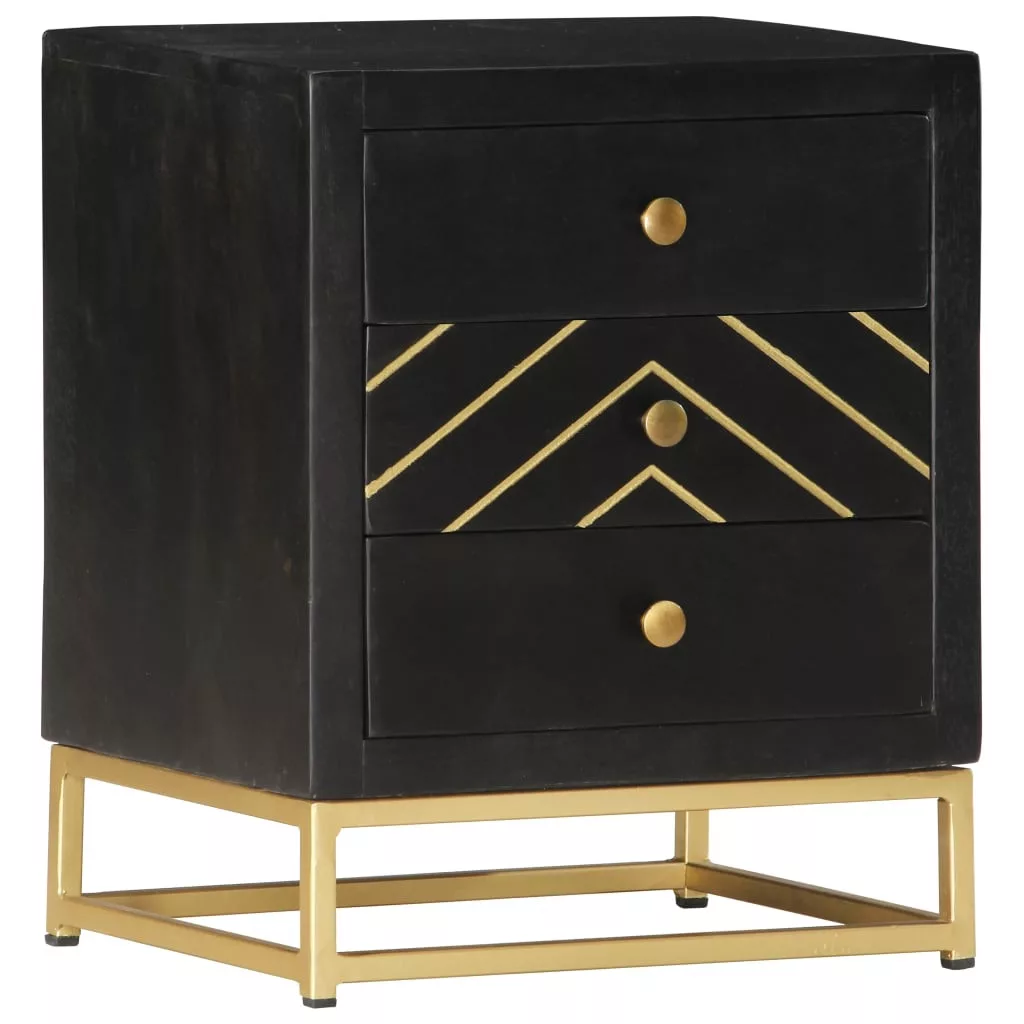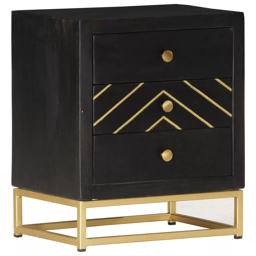 Ez a fekete és aranyozott bevonatú éjjeliszekrény dekoratív kiegészítője lesz hálószobájának. Az éjjeliszekrény kézzel készült tömör mangófából, mely rendkívül strapabíró, stabil, tartós, és gyönyörű, a kézműves munka viszont hozzájárul a látványos retró stílusához. A megmunkálás minden lépése a legnagyobb gondossággal történt, legyen szó akár a polírozásról, a festésről vagy a lakkozásról. A kézműves munkának és a fa gyönyörű erezetének köszönhetően minden bútordarab egyedi, és kissé eltér a többitől. Masszív asztallappal, valamint három fiókkal lett ellátva, amelyek bőséges helyet biztosítanak könyvek, szemüvegek, távirányítók és egyéb holmik rendezetten és kézközelben való tárolására. A termék összeszerelése egyszerű. Fontos megjegyzés: A bútorok színe darabonként változó, így minden bútordarab teljesen egyedi, és kis mértékben eltér a többitől. A kiszállítás véletlenszerűen történik.