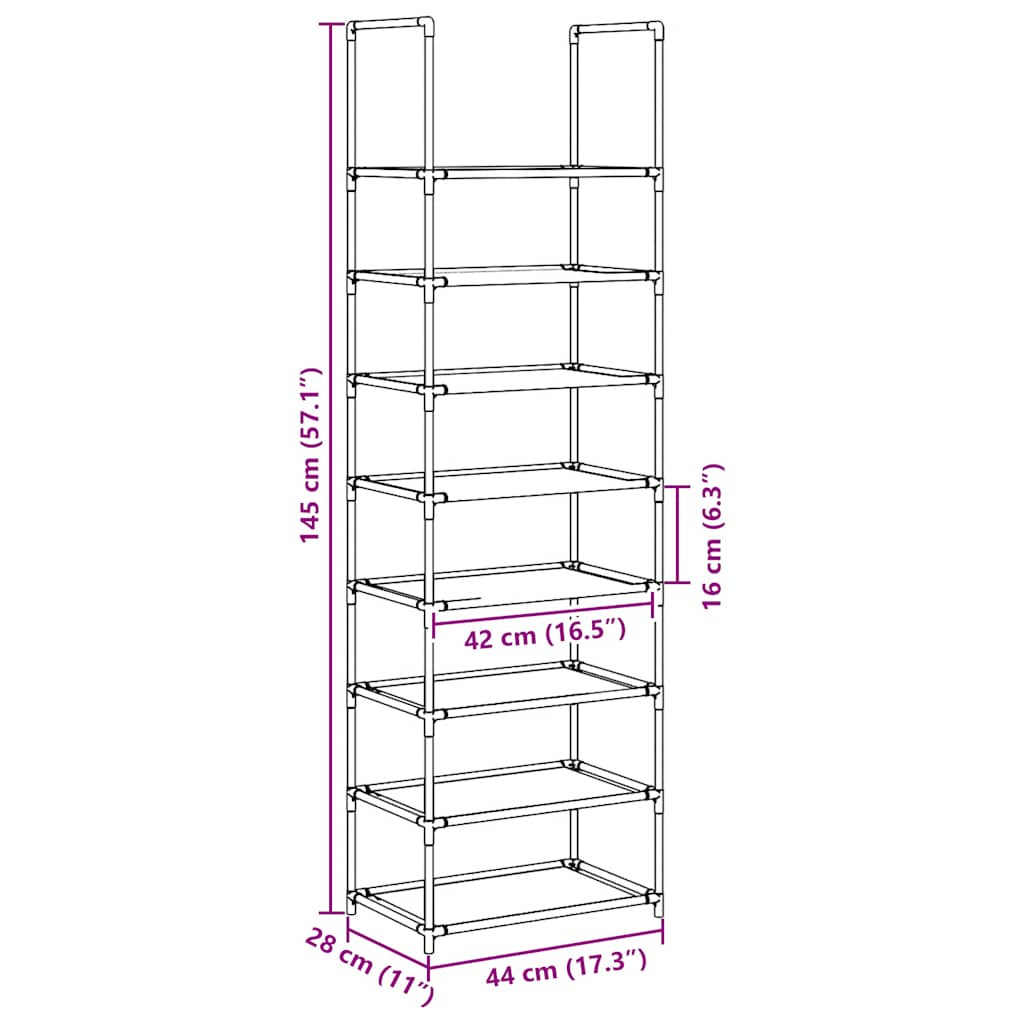 Tartsa cipőit rendben, és teremtsen takaros környezetet ezzel az elegáns cipőtartóval! Lélegző és tartós anyag: A nem szőtt anyagból készült polc könnyű, mégis strapabíró, légáteresztő képességet biztosít, amely frissen tartja a cipőt. Az anyag szakadásálló, és nedves ruhával könnyen letörölhető, így hosszú távú használatot biztosít.Robusztus és stabil váz: A porszórt acélváz erős, stabil, tartós, ellenáll a korróziónak és a zord időjárásnak, így biztosítja a tartós használatot.Bőséges tárolóhely: A 8 szintes kialakításnak köszönhetően ez a cipőtároló bőséges tárolókapacitást biztosít, lehetővé téve, hogy a teljes cipőkollekcióját rendben és jól rendszerezve tartsa egy kényelmes helyen.Helytakarékos kialakítás: A cipőpolc sok pár cipő befogadására alkalmas anélkül, hogy túl sok helyet foglalna. Tökéletesen elhelyezhető az előszobában, előszobában, az ajtó mellett, a fürdőszobában, a nappaliban vagy bármely olyan helyen, ahol hatékony tárolásra van szüksége.Multifunkcionális tárolási megoldás: A szövetpolcok más tárgyak, például táskák, sálak vagy kisebb tárolóedények tárolására is használhatók. Ez a sokoldalúság átfogó tárolási megoldást kínál egy egységben. Figyelem:A felborulás elkerülése érdekében ezt a terméket fali rögzítőeszközzel (nem tartozék) kell használni.