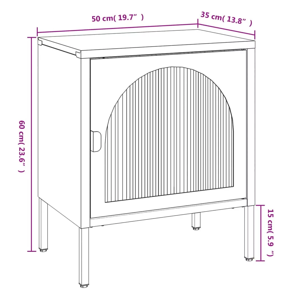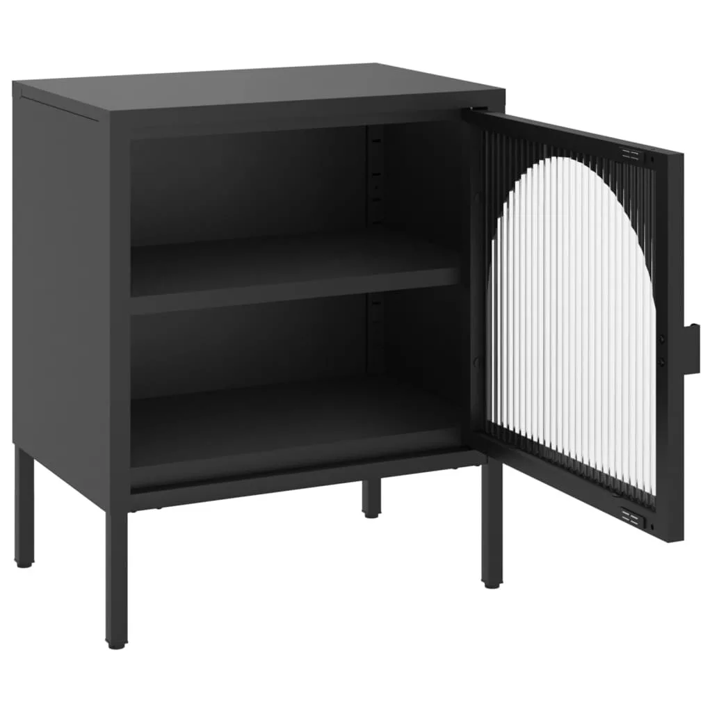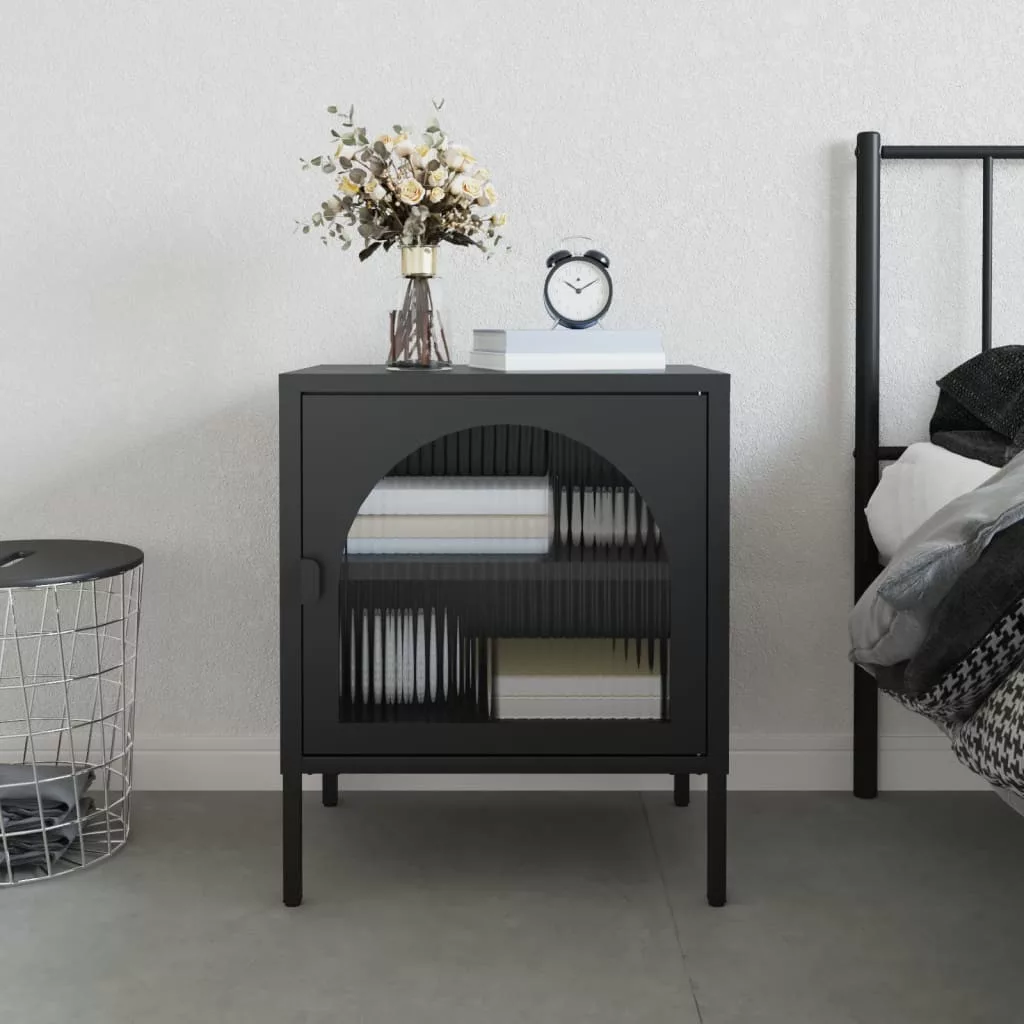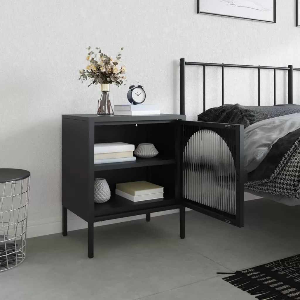 Ez az elegáns éjjeliszekrény otthona időtálló kiegészítője lesz. Stabil anyag: Az éjjeliszekrény váza porszórt acélból készült. Az acél rendkívül kemény és erős anyag. Erős szerkezetet és stabilitást biztosít. Az acél porszórata védőréteget képez a kopással szemben.Hornyolt üveg: A hornyolt üveg függőleges textúrájú, és dombornyomással matt felületet képez, lehetővé téve az átlátszóságot és a belátás gátlást is.Bőséges tárolóhely: A szekrény praktikus helyet biztosít magazinjai, könyvei, távirányítói és egyéb apró tárgyai kézközelben történő rendezett tárolásához.Állítható polc: Az ágy melletti szekrény 1 állítható polccal rendelkezik, amelyre különböző magasságú és méretű tárgyakat tud elhelyezni, elkerülve a helypazarlást.Szintezők az alján: Az alján találhatók, amelyek stabilizálják a szekrényt, ha egyenetlen padlón áll.Stabil asztallap: A kisszekrény stabil felső lapja ideális dísztárgyak, például vázák és cserepes növények számára.