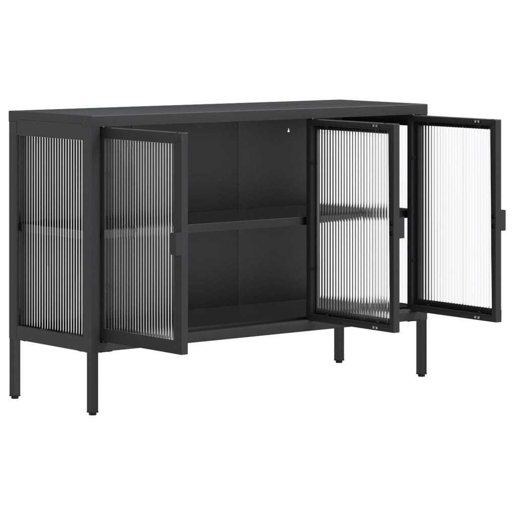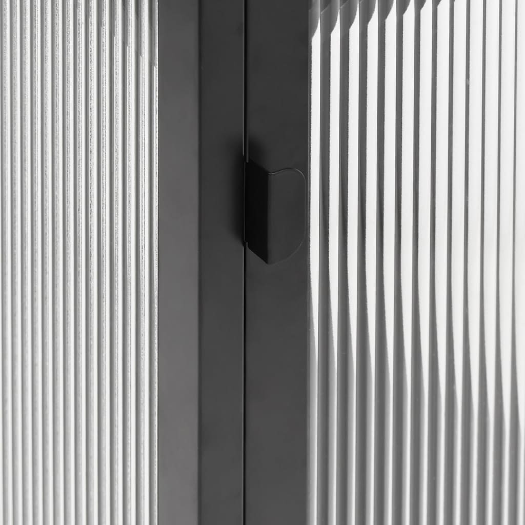 Ez a klasszikus, modern megjelenésű tálalószekrény praktikus és dekoratív kiegészítője lesz belső terének. Stabil anyag: A szekrény váza porszórt acélból készült. Az acél rendkívül kemény és erős anyag. Erős szerkezetet és stabilitást biztosít. Az acél porszórata védőréteget képez a kopással szemben.Hornyolt üveg: A hornyolt üveg függőleges textúrájú, és dombornyomással matt felületet képez, lehetővé téve az átlátszóságot és a belátás gátlást is.Bőséges tárolóhely: A tálalószekrény bőséges helyet biztosít alapvető holmijai kézközelben történő rendezett tárolásához.Állítható polc: A szekrény 1 állítható polccal lett felszerelve, amelyre különböző magasságú és méretű tárgyakat tud elhelyezni, elkerülve a helypazarlást.Szintezők az alján: Az alján találhatók, amelyek stabilizálják a szekrényt, ha egyenetlen padlón áll.Bemutató funkció: A tárolószekrény teteje tökéletes dísztárgyak, fotóalbumok vagy kis növények elhelyezésére. Figyelem:A felborulás elkerülése érdekében ezt a terméket a mellékelt fali rögzítőeszközzel kell használni.