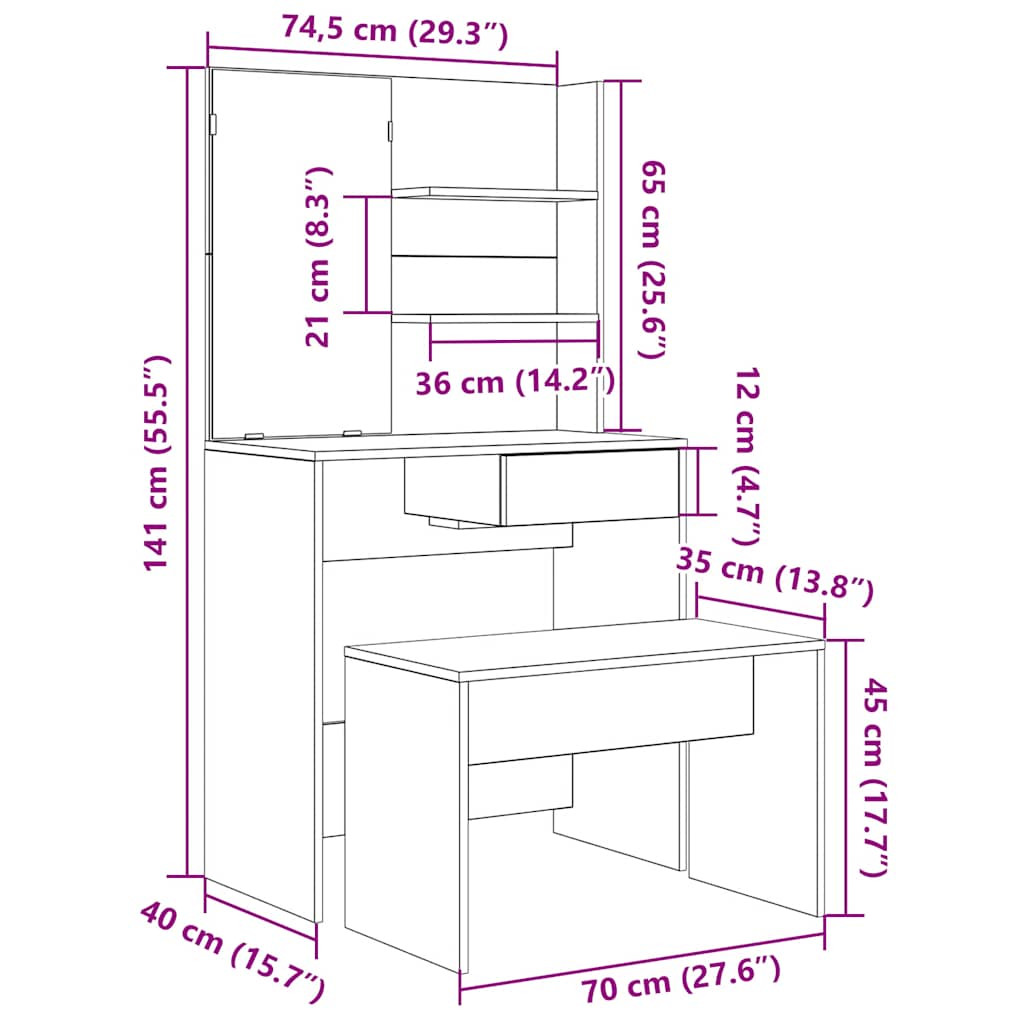 Ez a divatos öltözőasztal-készlet kiváló kiegészítője hálószobája berendezésének. A kozmetikumokat is elérhető közelségben tartja! Tartós anyag: A szerelt fa kivételes minőségű, sima felületű, szilárd, stabil, és ellenáll a nedvességnek.Használati tükör: A mellékelt gyönyörű tükör tiszta kilátást biztosít a sminkeléshez, és elegánsabbá teszi a sminkpultot.Bőséges tárolóhely: A sminkasztal bőséges tárolóhelyet kínál, hogy kozmetikai kellékei jól rendszerezve maradjanak, így rendezett és tiszta asztallapot hagyva Önnek.Könnyen karbantartható: A mosdóasztal sima felületének köszönhetően könnyen tisztítható nedves ruhával, és kevesebb karbantartást igényel. Figyelem:A felborulás elkerülése érdekében ezt a terméket a mellékelt fali rögzítőeszközzel kell használni. Maximum 110 kg ülésenként.