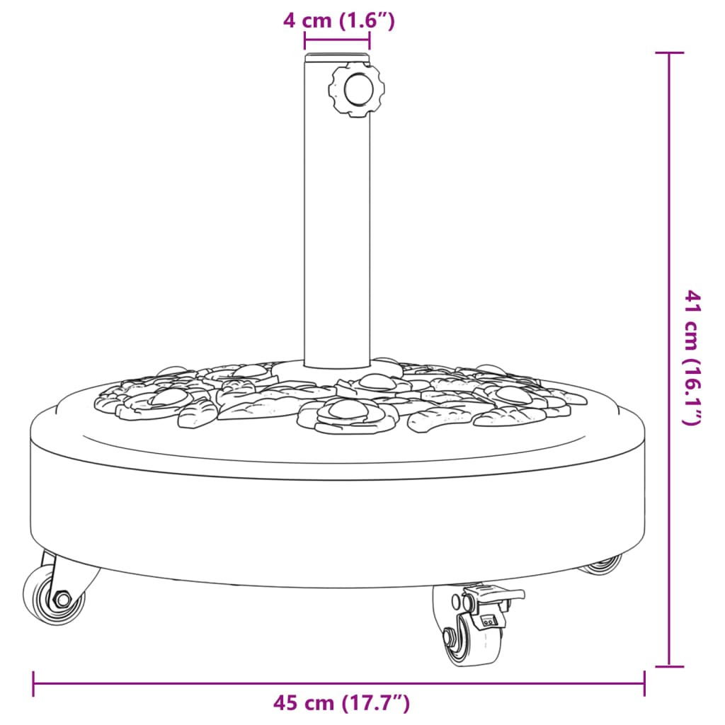 Ez a napernyő talp erős és megbízható alapot biztosít, hogy az ernyő stabilan és függőlegesen maradjon. Erős és stabil talp: Ez a napernyőtalp betonnal töltött tartós műanyag házzal rendelkezik, amely kivételes stabilitást biztosít, hogy biztonságosan a helyén tartsa a napernyőt, és megakadályozza a felborulását még szeles időben is.Könnyű mozgathatóság: A zárható görgőkkel felszerelt napernyőtalp segítségével könnyedén áthelyezheti a napernyőt a kívánt helyre, és biztonságosan a helyére rögzítheti a fokozott biztonság érdekében.Könnyen felszerelhető: Ez az ernyőtartó egy szorítógombbal rendelkezik, hogy szilárdan az alaphoz rögzíthesse az ernyőt.Többféle rúdmérettel is kompatibilis: Ez az esernyőtalp 2 rúd-adapterrel rendelkezik, így 38 és 48 mm átmérőjű ernyőrudakhoz is illeszkedik.Gyönyörű virágmintás: Ez a virágmintákkal készült napernyőtartó időtlen eleganciát kölcsönöz a kültéri területnek.