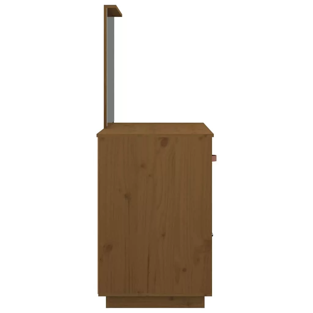 A tükörrel ellátott fa fésülködőasztal hálószobája nagyszerű kiegészítője lesz, miközben kézközelben tarthatja kozmetikumait! Tömör fenyőfa: A tömör fenyőfa egy gyönyörű természetes anyag. A fenyőfa erezete egyenes, a csomók pedig jellegzetes, rusztikus megjelenést kölcsönöznek az anyagnak.Bőséges tárolóhely: A fiók és a 2 rekesz helyet biztosít a sminkeszközöknek, és mindennek meglesz a saját helye.Hasznos tükör: A mellékelt gyönyörű tükör segít a sminkelésben, és elegánsabbá teszi a sminkasztalt.Praktikus ajtó: Tartsa pormentesen legfontosabb dolgait azzal, hogy a sminkasztal ajtaja mögé rejti őket. Figyelem:A dőlés megakadályozása érdekében a terméket a mellékelt tartóelem segítségével rögzíteni kell a falhoz. Megjegyzés:Az egyszerű összeszerelés érdekében minden termékhez mellékelünk összeszerelési útmutatót.