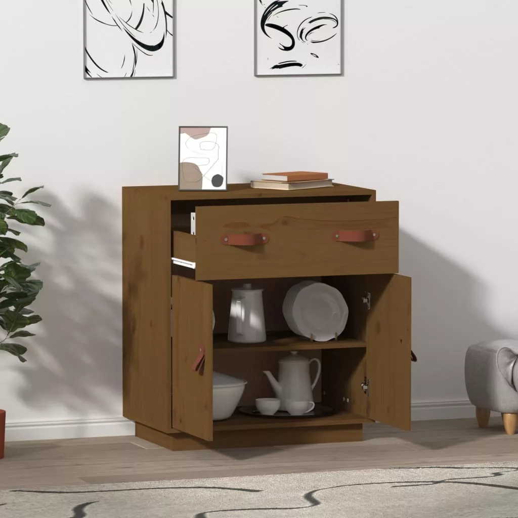 Ez a praktikus fa tálalószekrény számos igényét kielégíti, és a helyiség ideális kiegészítője lesz. Tömör fenyőfa: Ez a szekrény tömör fenyőfából készült. A tömör fenyőfa egy gyönyörű, természetes anyag. A fenyőfa egyenes erezetű, a csomók pedig jellegzetes, rusztikus megjelenést kölcsönöznek a bútornak.Bőséges tárolóhely: A tárolószekrény elegendő tárolóhelyet kínál holmijai rendezett és kézközelben történő tárolásához.Masszív felső lap: A szekrény felső lapján elhelyezheti kedvenc fényképeit, dísztárgyait vagy virágokat a szoba dekorációjának gazdagítása érdekében.Praktikus kialakítás: Ez a tálalószekrény ajtóval lett felszerelve, amely megvédi dolgait a portól és szennyeződésektől. Figyelem:A dőlés megakadályozása érdekében a terméket a mellékelt tartóelem segítségével rögzíteni kell a falhoz. Megjegyzés:Az egyszerű összeszerelés érdekében minden termékhez mellékelünk összeszerelési útmutatót.