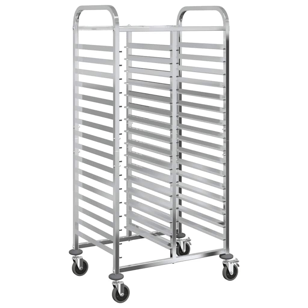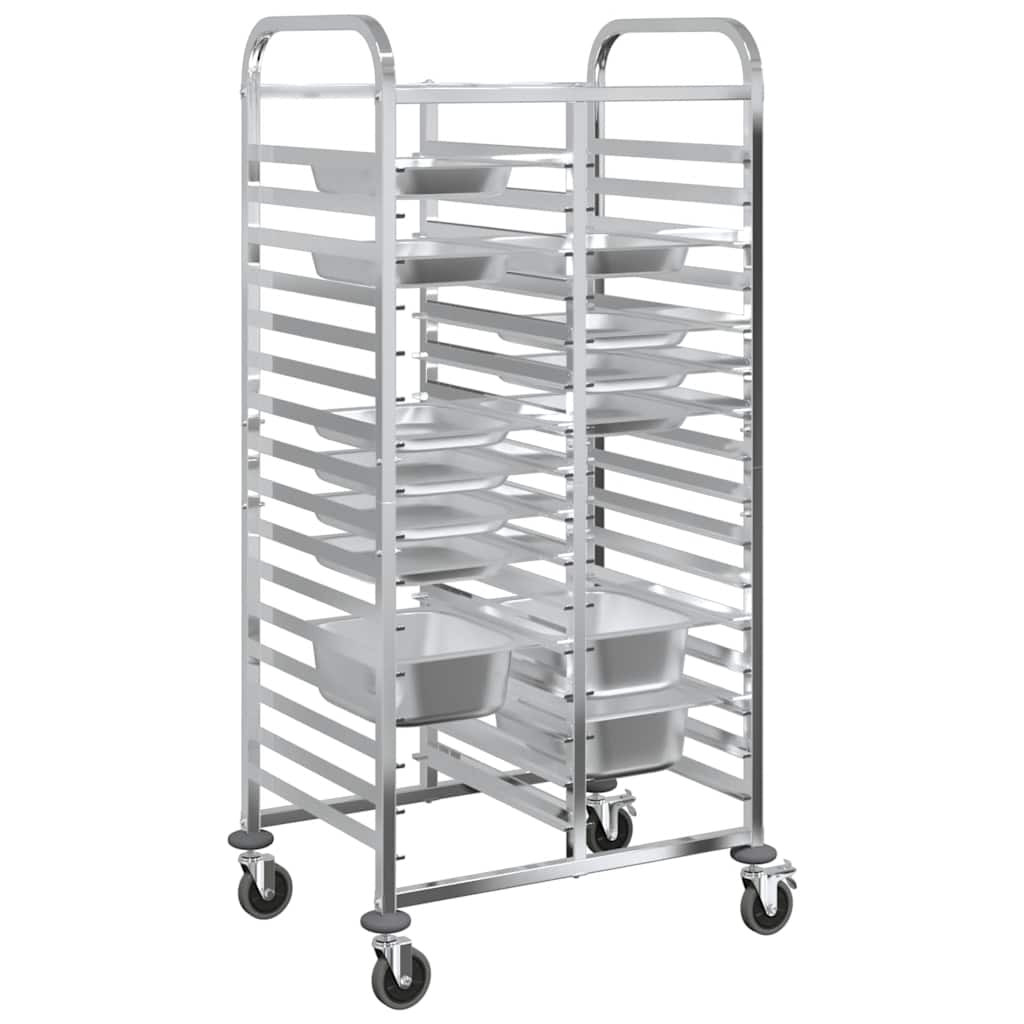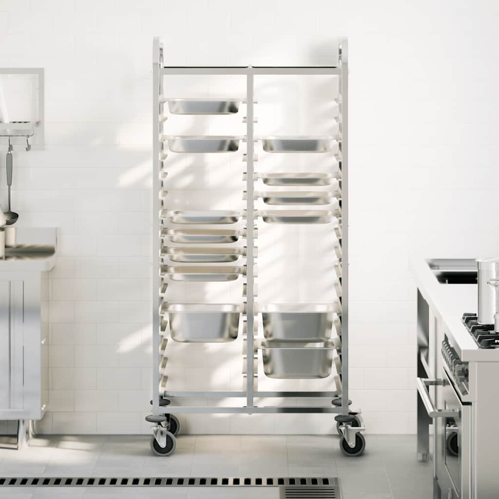 Növelje konyhája hatékonyságát a tálcás kocsival, amelyet tartósságra és rugalmas mozgásra terveztek. Tartós konstrukció: A rozsdamentes acélból készült tálcás kocsi hosszú élettartamot és korrózióállóságot garantál, így könnyen tisztítható, és számos alkalomra ideális.Nagy tálcakapacitás: A több tálcanyílással rendelkező kocsi hatékony tárolási és szállítási megoldásokat kínál. Akár 32 GN 1/1 tartály befogadására alkalmas, maximális mélységük 65 mm, és elég sokoldalú a GN 1/2, 1/3, 2/3 és 2/8 méretű GN méretűek tárolására. Kérjük, vegye figyelembe, hogy mélyebb tartályok használata esetén kevesebb tartály tárolható.Rugalmas és stabil mobilitás: Négy hangtalanul forgó görgővel, köztük kettővel rögzítőfékekkel, a kocsi könnyedén siklik a különböző felületeken. A fékek további stabilitást biztosítanak, és szükség esetén biztonságosan a helyén tartják.Helytakarékos kialakítás: A kompakt és ergonomikus kialakítás maximalizálja a tárolási hatékonyságot anélkül, hogy a mobilitás rovására menne, így a kocsi tökéletes a konyhák, vendéglátóipari berendezések vagy élelmiszeripari környezetek szűk helyiségeiben.Könnyen tisztítható: A kocsi sima, rozsdamentes acélból készült felülete megkönnyíti a gyors és egyszerű tisztítást. Egy egyszerű nedves ruhával vagy enyhe tisztítószerrel történő egyszerű áttörléssel eltávolíthatóak a kiömlött folyadékok vagy foltok, így ideális a forgalmas konyhákban és a vendéglátóhelyiségekben. Jó tudni:A tálcák nem tartoznak a szállításhoz.Ha a GN-tartályok mélyebbek, kevesebb tartályt kell elhelyezni a tálcás kocsiban.