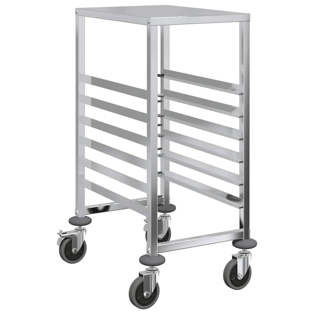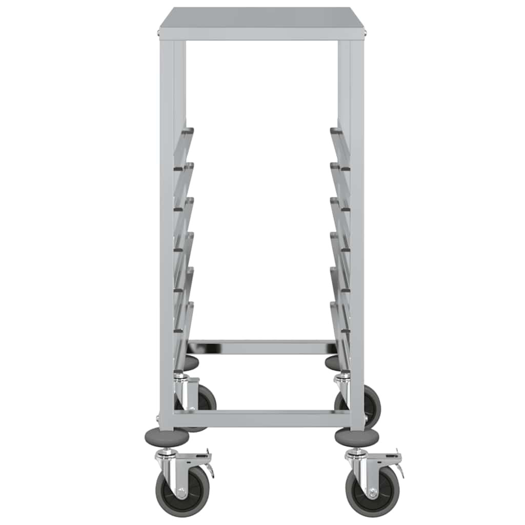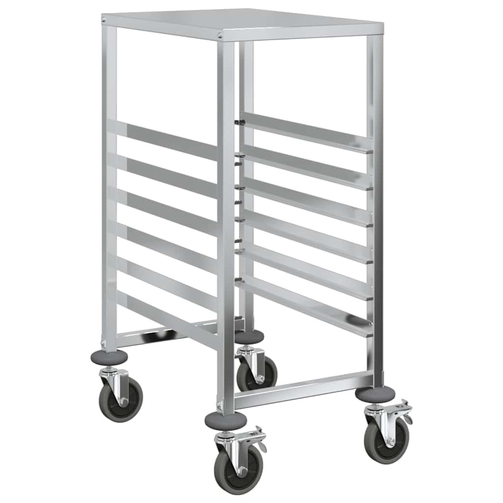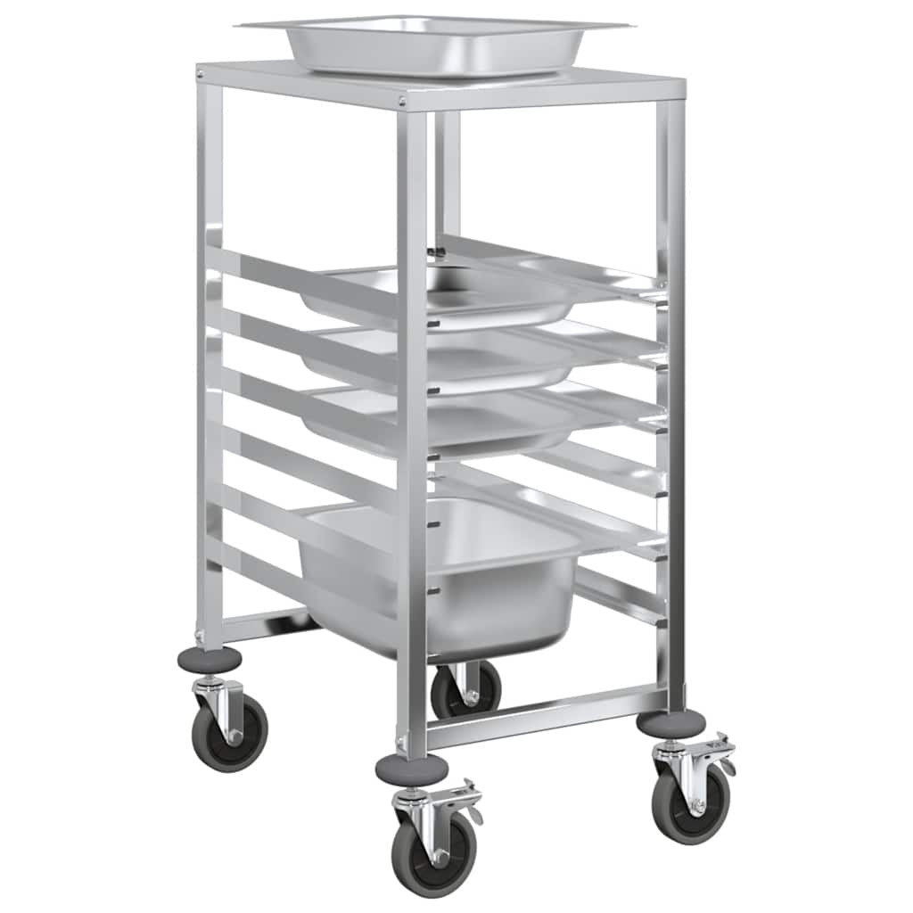 Növelje konyhája hatékonyságát a tálcás kocsival, amelyet tartósságra és rugalmas mozgásra terveztek. Tartós konstrukció: A rozsdamentes acélból készült tálcás kocsi hosszú élettartamot és korrózióállóságot garantál, így könnyen tisztítható, és számos alkalomra ideális.Nagy tálcakapacitás: A több tálcanyílással rendelkező kocsi hatékony tárolási és szállítási megoldásokat kínál. Akár 6 GN 1/1 tartály befogadására alkalmas, maximális mélységük 65 mm, és elég sokoldalú a GN 1/2, 1/3, 2/3 és 2/8 méretű GN méretűek tárolására. Kérjük, vegye figyelembe, hogy mélyebb tartályok használata esetén kevesebb tartály tárolható.Rugalmas és stabil mobilitás: Négy hangtalanul forgó görgővel, köztük kettővel rögzítőfékekkel, a kocsi könnyedén siklik a különböző felületeken. A fékek további stabilitást biztosítanak, és szükség esetén biztonságosan a helyén tartják. A felső platform alsó része hangszigetelt pamuttal van felszerelve, amely egyenletes mobilitást biztosít, miközben minimalizálja a zajt a nagyobb kényelem érdekében.Helytakarékos kialakítás: A kompakt és ergonomikus kialakítás maximalizálja a tárolási hatékonyságot a mobilitás veszélyeztetése nélkül. Ezenkívül a felső platform extra helyet biztosít a konyhai eszközök elhelyezéséhez, így a kocsi ideális szűk helyekre konyhákban, vendéglátó-ipari létesítményekben vagy étkeztetési környezetben.Könnyen tisztítható: A kocsi sima, rozsdamentes acélból készült felülete megkönnyíti a gyors és egyszerű tisztítást. Egy egyszerű nedves ruhával vagy enyhe tisztítószerrel történő egyszerű áttörléssel eltávolíthatóak a kiömlött folyadékok vagy foltok, így ideális a forgalmas konyhákban és a vendéglátóhelyiségekben. Jó tudni:A tálcák nem tartoznak a szállításhoz.Ha a GN-tartályok mélyebbek, kevesebb tartályt kell elhelyezni a tálcás kocsiban.